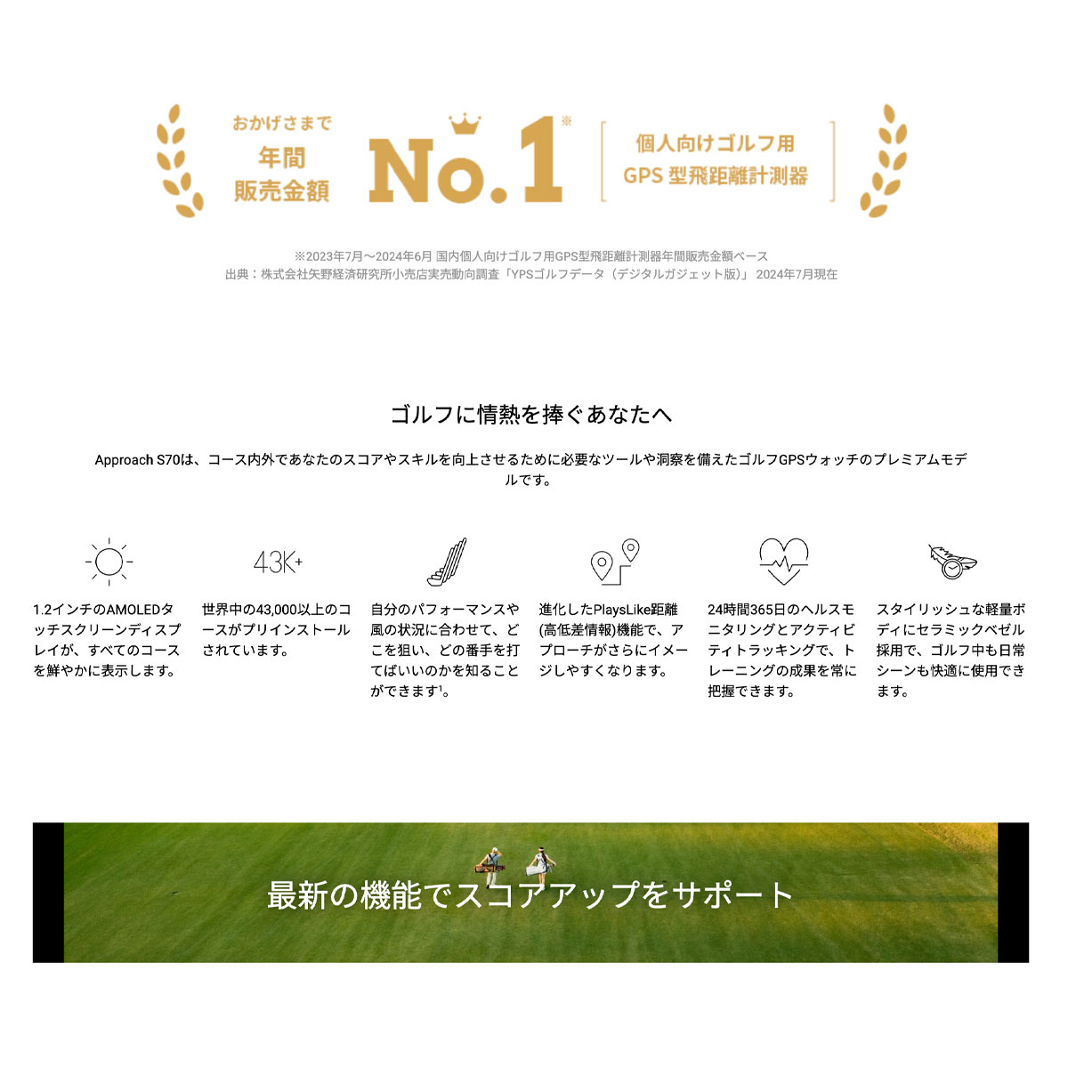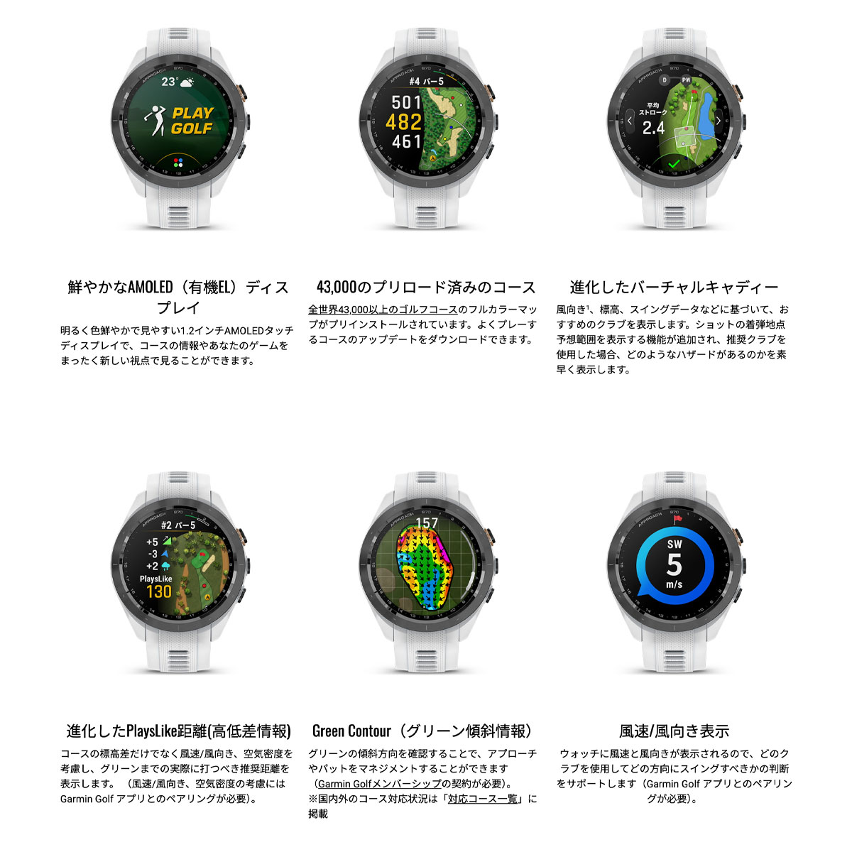 スタイル&機能をさらにアップデートしたゴルフGPSウォッチのGarmin最上位モデル。そして、より多くのゴルファーの方に対応できるよう、ケースサイズが47mmと42mmの2モデルをラインナップ。ディスプレイには、色鮮やかなAMOLEDディスプレイを採用し、ゴルフ場の直射日光下でも色鮮やかな表示で優れた視認性を発揮します。画面上に表示されるコースマップは解像度が上がり、ハザードとなる木などが立体的に表示され、よりリアルにコースをイメージしやすくなりました。また、過去最大となる全世界約43000のゴルフコースが収録され、国内は98%のゴルフ場をカバー。直感的に操作しやすいタッチスクリーンにより、様々な機能を活用してスコアアップに役立てることができます。
