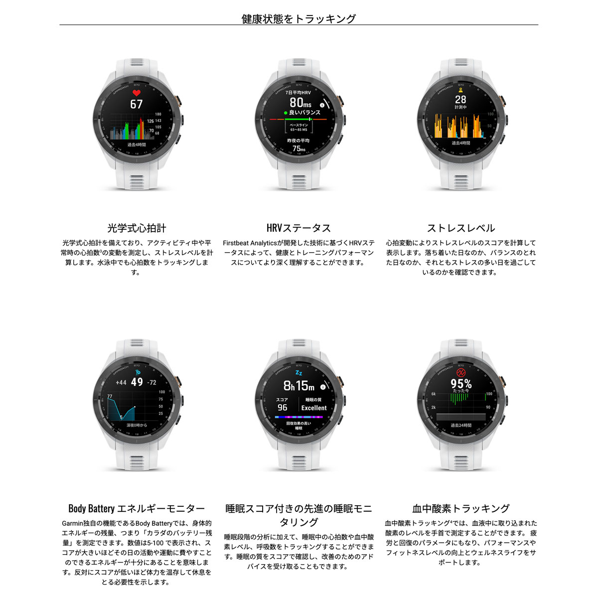 ■ライフログ機能:ステップ数、心拍数、Body Battery、睡眠モニタリング、ストレスレベル、消費カロリー、週間運動量、血中酸素トラッキング※2、フィットネス年齢、時差ボケアドバイザーなど