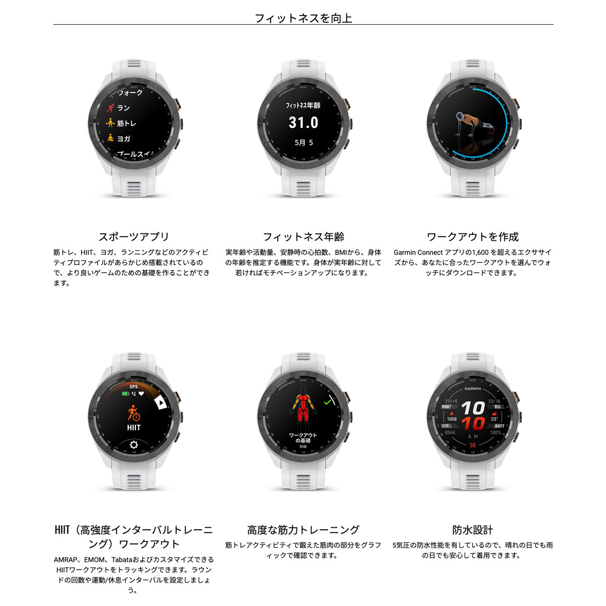 ■スポーツ機能:ランニング、サイクリング、プールスイム、ハイキング、スキー、スノーボード、筋力トレーニング、屋内クライミング、クロスカントリースキー、SUP、バーチャルランニング、ヨガ、ピラティス、ゴルフ、HIITなど40種類以上