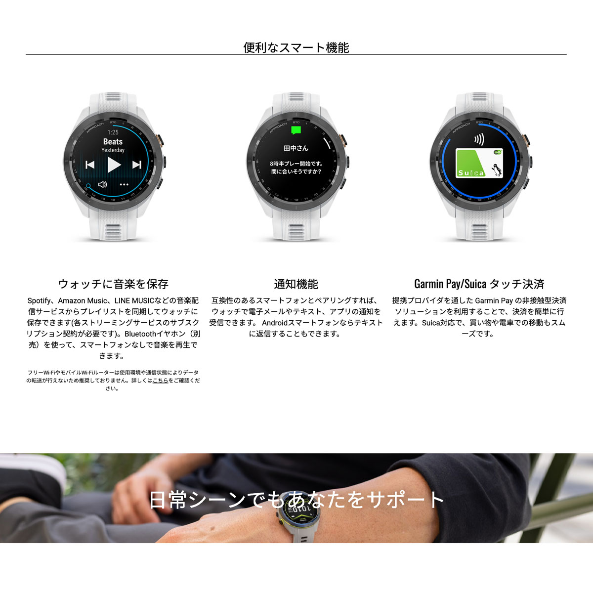 ■スマート機能:通知機能、Suica、Garmin Pay、天気情報、音楽機能(Spotify、Amazon Music、LINE Musicのストリーミング配信に対応/最大2000曲まで保存可能)など