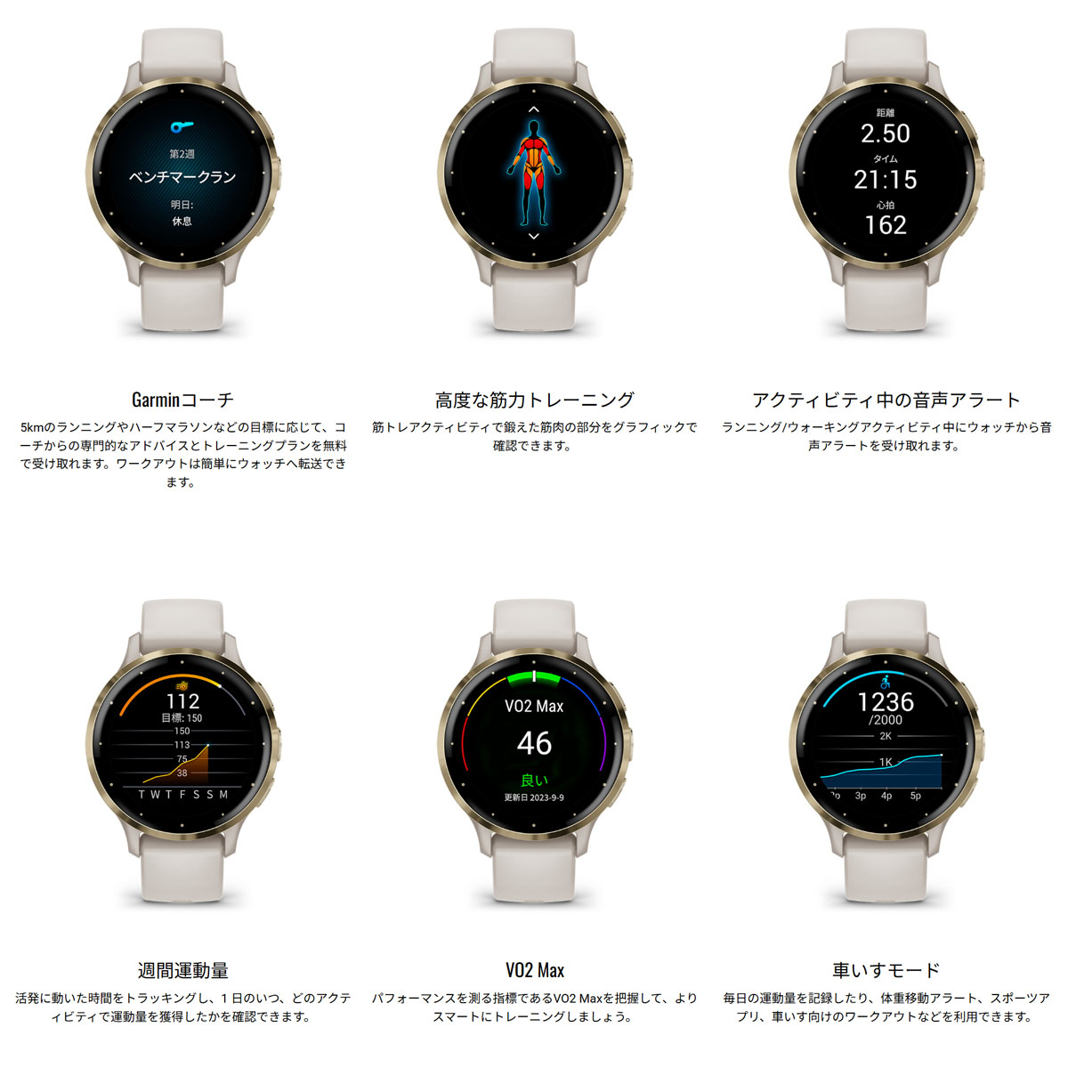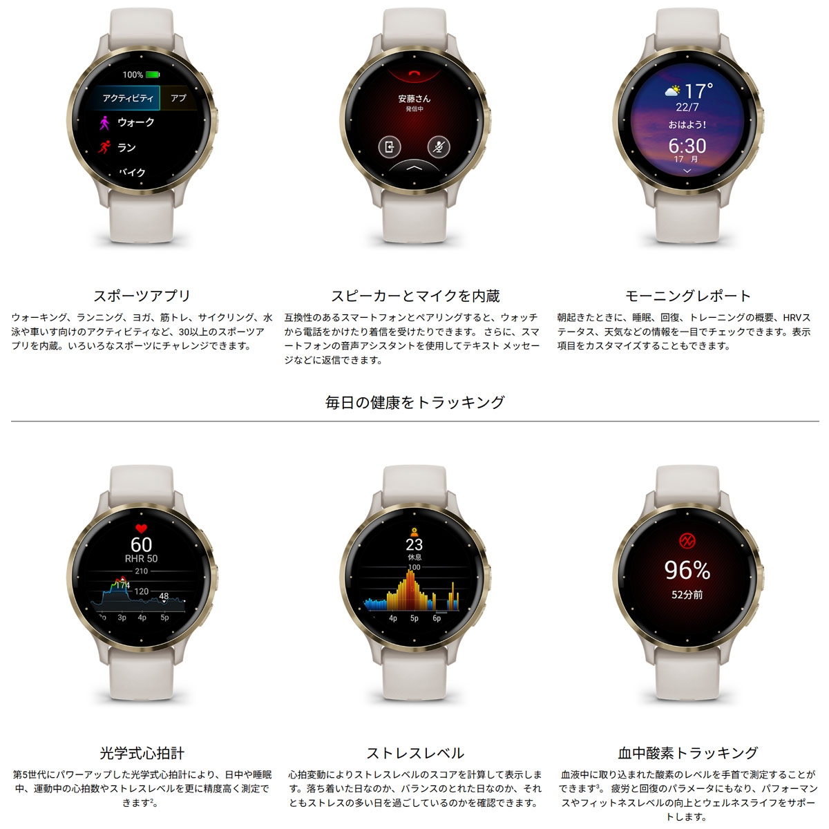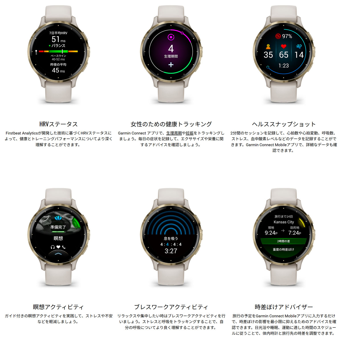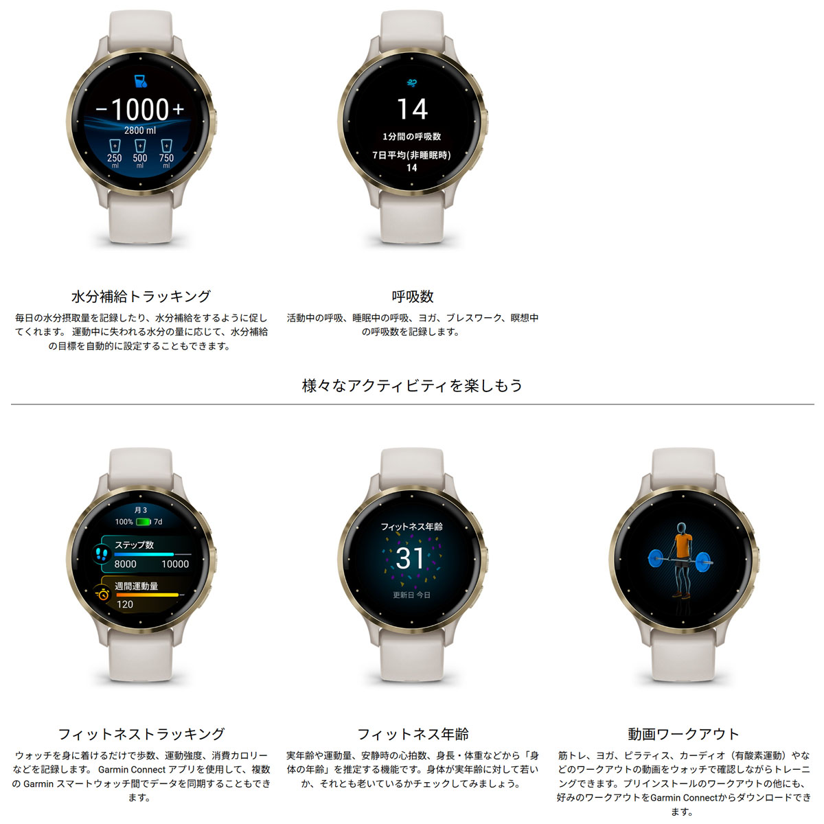 ■ライフログ機能:ステップ数、ステップゴール、距離、消費カロリー、日時表示、ムーブバー、生理周期トラッキング、妊娠トラッキング、睡眠モニタリング、睡眠スコア、上昇階数、週間運動量、水分補給トラッキング、呼吸数、ストレスレベル、ヘルススナップショット、血中酸素トラッキング、Body Batteryなど
