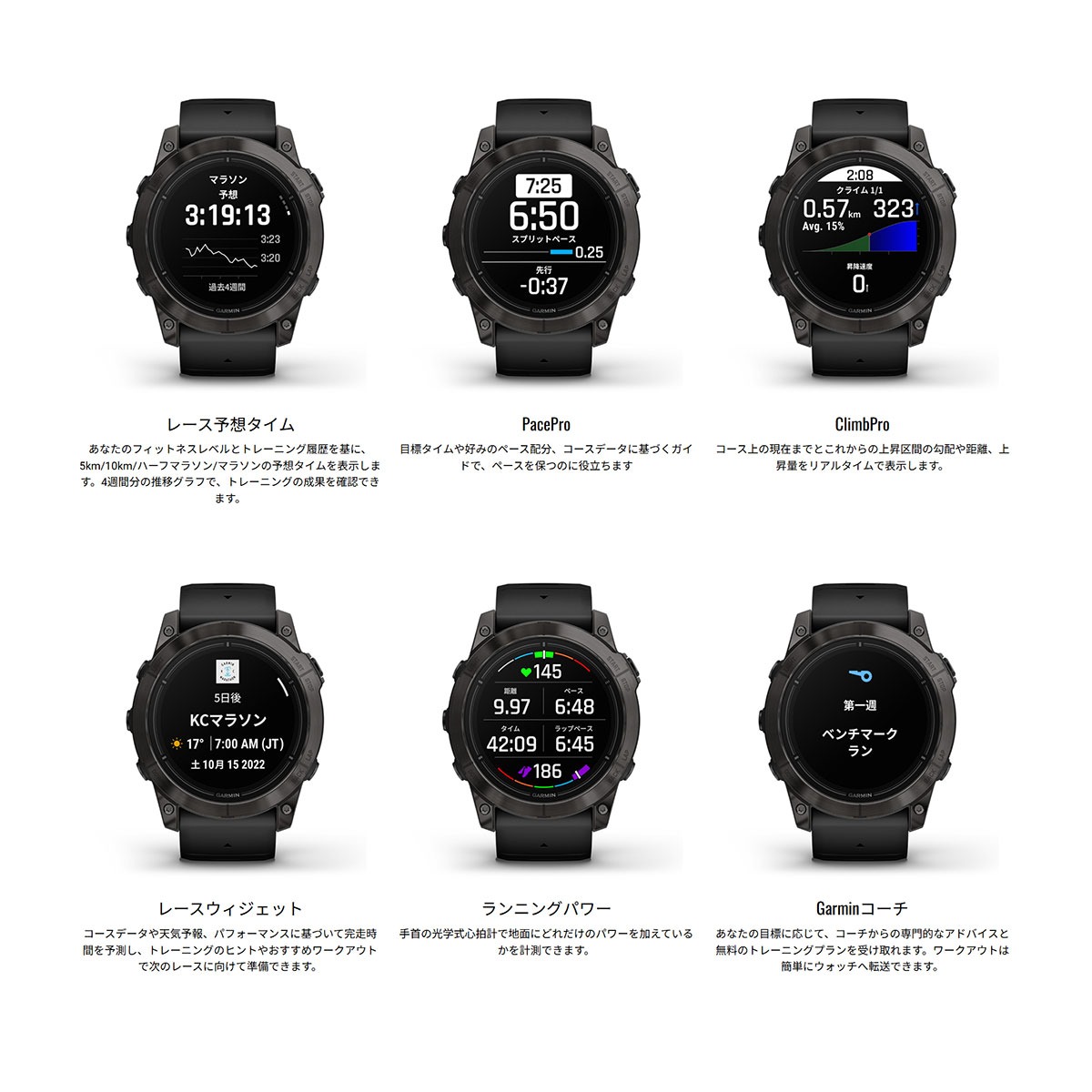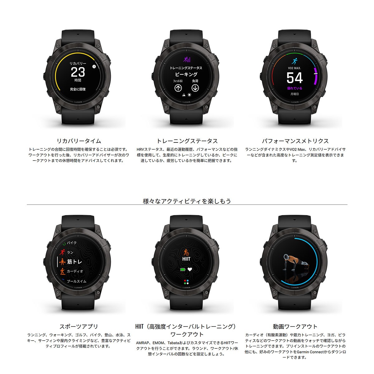 最先端のテクノロジーを搭載し、選び抜かれたマテリアルと、ビジネスにもスポーツにもフィットする洗練されたデザインで、ビジネスアスリートの365日あらゆる側面をサポートするハイグレードGPSスマートウォッチ。新モデルとなる「epix Pro」シリーズは、美しいAMOLEDディスプレイを搭載し選びやすい3サイズ展開。また、全シリーズに必要に応じてすぐに使える明るいLEDフラッシュライトが搭載。光学式心拍計は第5世代に進化。8つのセンサーと配置し、過酷な環境下での激しいスポーツ中でもより高精度な計測を実現し、仕事もプライベートも妥協しない、パフォーマンスアップを目指す方をサポートします。