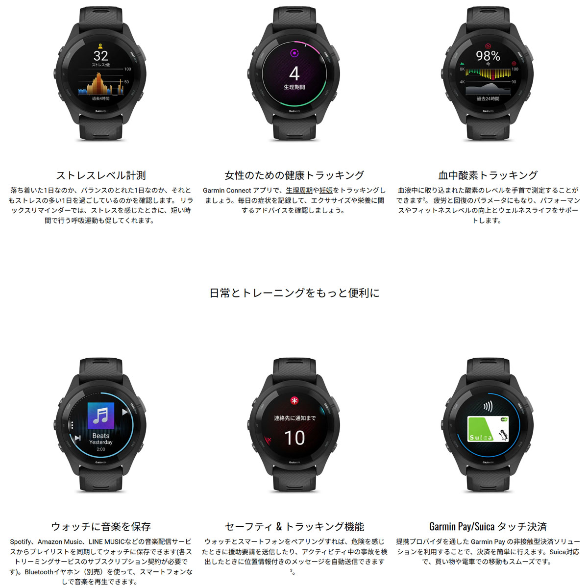 『Forerunner 265』シリーズは、大会出場やフルマラソン完走を目指してランを楽しむチャレンジランナーに向けたGPSランニングスマートウォッチ。今回新たに色鮮やかなAMOLEDタッチディスプレイを備えたモデルが登場。また、上位機種のみに搭載されていた「トレーニングレディネス」が追加され、その日の体調に応じて、無理のないトレーニング提案を提供します。タッチスクリーン操作を『Forerunner 265』『Forerunner 265S』でも採用し、ボタン操作とのダブルインターフェイスで、操作性がアップしました。日常生活に役立つスマート機能も備え、効果的なトレーニングや日頃の健康管理のための機能が搭載され、「すべての”走る人”」をサポートします。