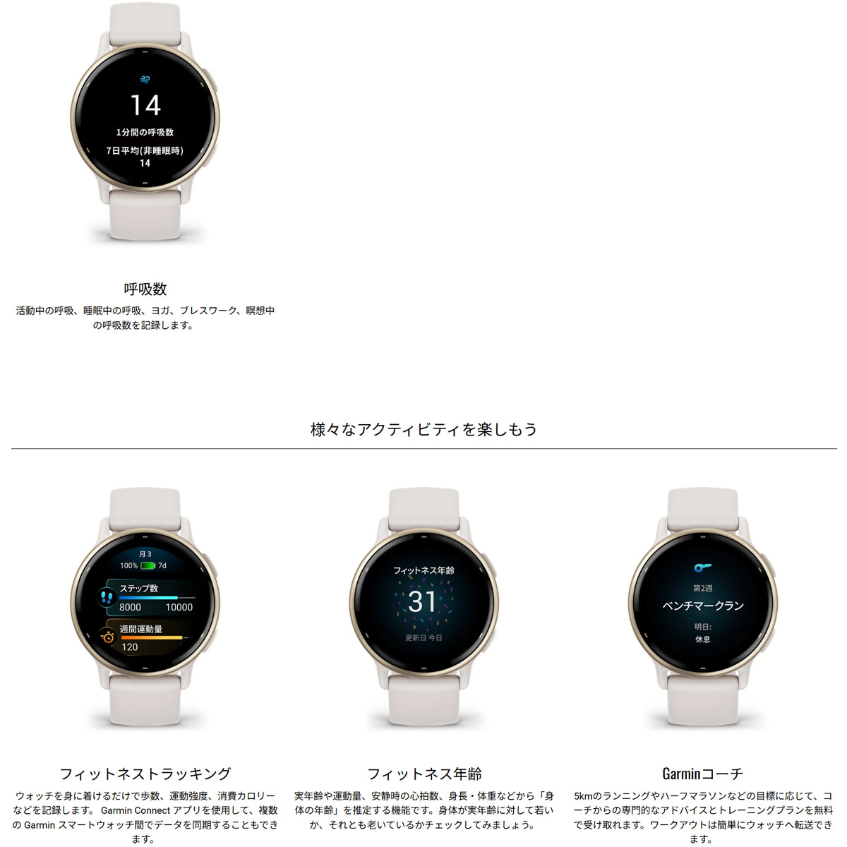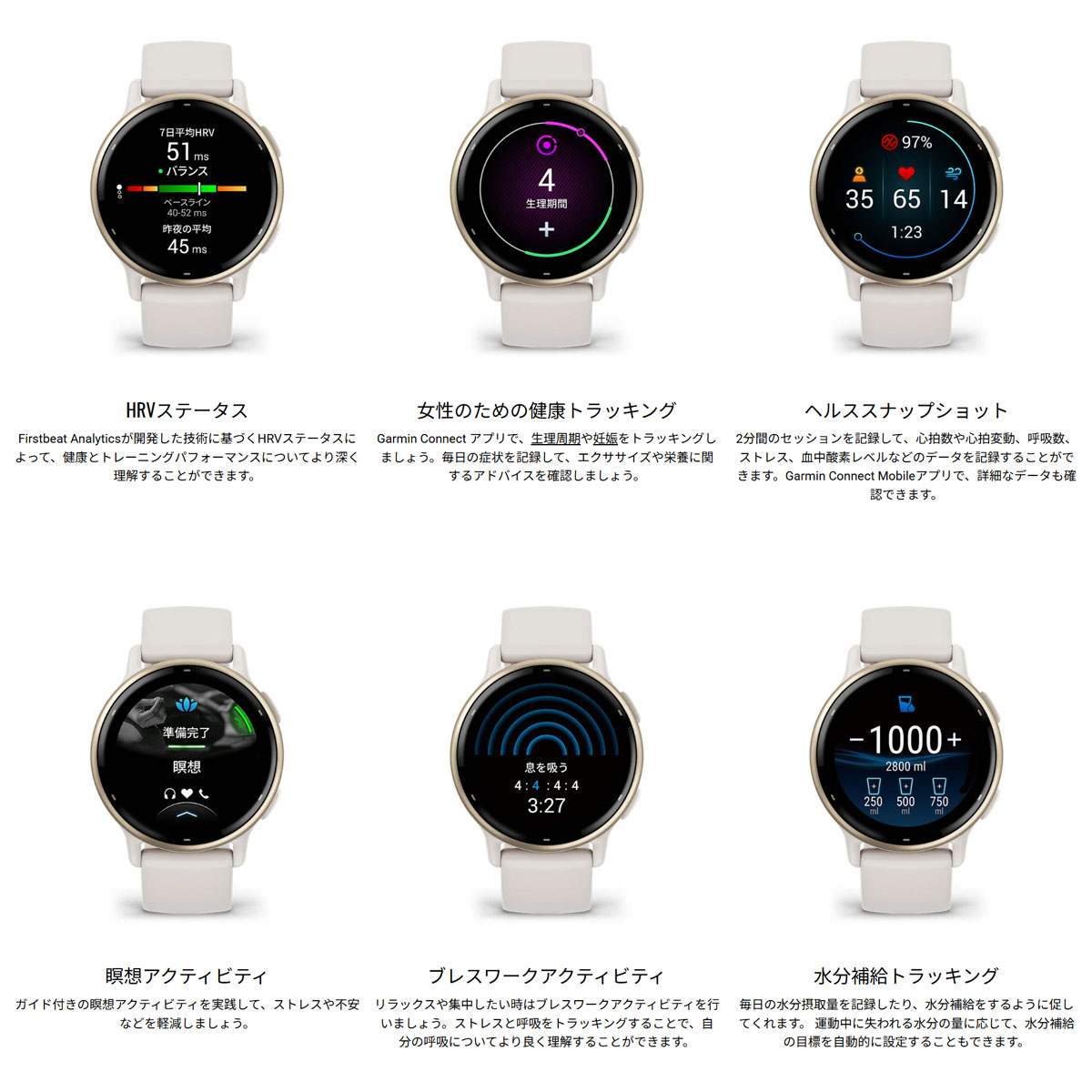 ■ライフログ機能:ステップ数、ステップゴール、距離、消費カロリー、日時表示、ムーブバー、生理周期トラッキング、妊娠トラッキング、睡眠モニタリング、睡眠スコア、上昇階数、週間運動量、水分補給トラッキング、呼吸数、ストレスレベル、ヘルススナップショット、血中酸素トラッキング、Body Batteryなど