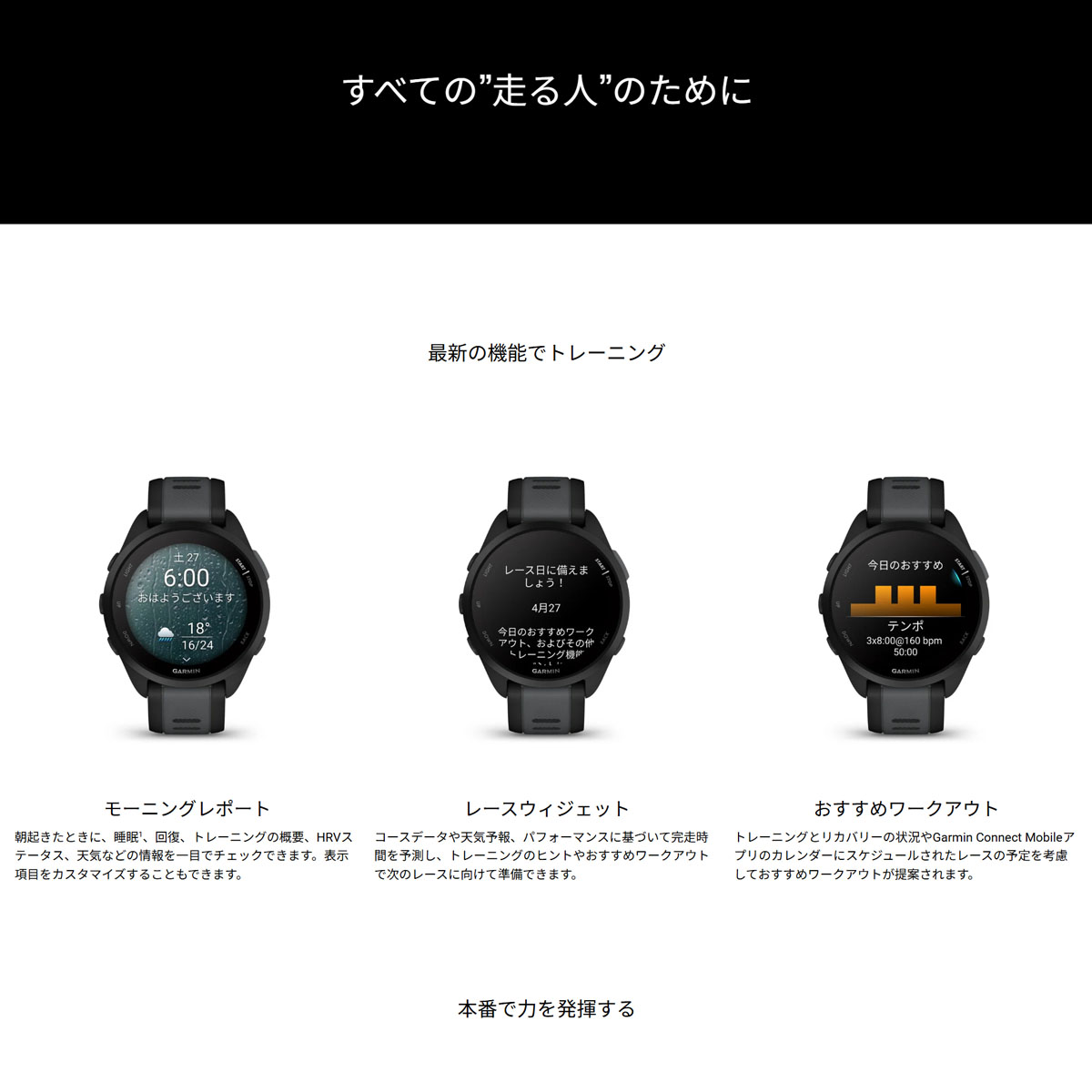 『Forerunner 165』は、ランニング初心者におすすめのエントリーモデル。1.2インチ、AMOLEDディスプレイを採用し、発色がよく鮮やかで、奥行き感もあるカラーディスプレイと、大きな数字や文字、一目でわかるグラフなどを活用したディスプレイは、直射日光下などランニング中でも見やすく、ランニング スマートウォッチ初心者にわかりやすくデザインされています。操作は5つのボタンとタッチスクリーン操作のダブルインターフェイス。ランニング中は誤作動を防ぐためのボタン操作、日常ではタッチ操作とシーンに合わせた操作が可能。高精密な計測とランニングサイエンスにもとづく高機能で不動の人気を誇るGarminランニングGPSウォッチに最新エントリーモデル。スマートウォッチとしての機能も充実。心拍数、呼吸数、歩数、消費カロリーなどベーシック機能に加え、体のエネルギー状態を数値化する独自の指標「Body Battery」、ストレスレベル、睡眠の質を測る睡眠スコアなど多彩なヘルスモニタリング機能を搭載しています。Suica※にも対応する電子決済機能や各種通知機能も標準装備しています。※Suicaは東日本旅客鉄道株式会社の登録商標です。『Forerunner 165 Music』は、複数のストリーミングサービスに対応する音楽機能も装備。ウォッチに最大450曲を保存できるので、ウォッチ一つで音楽を楽しみながらのランニングが可能です。