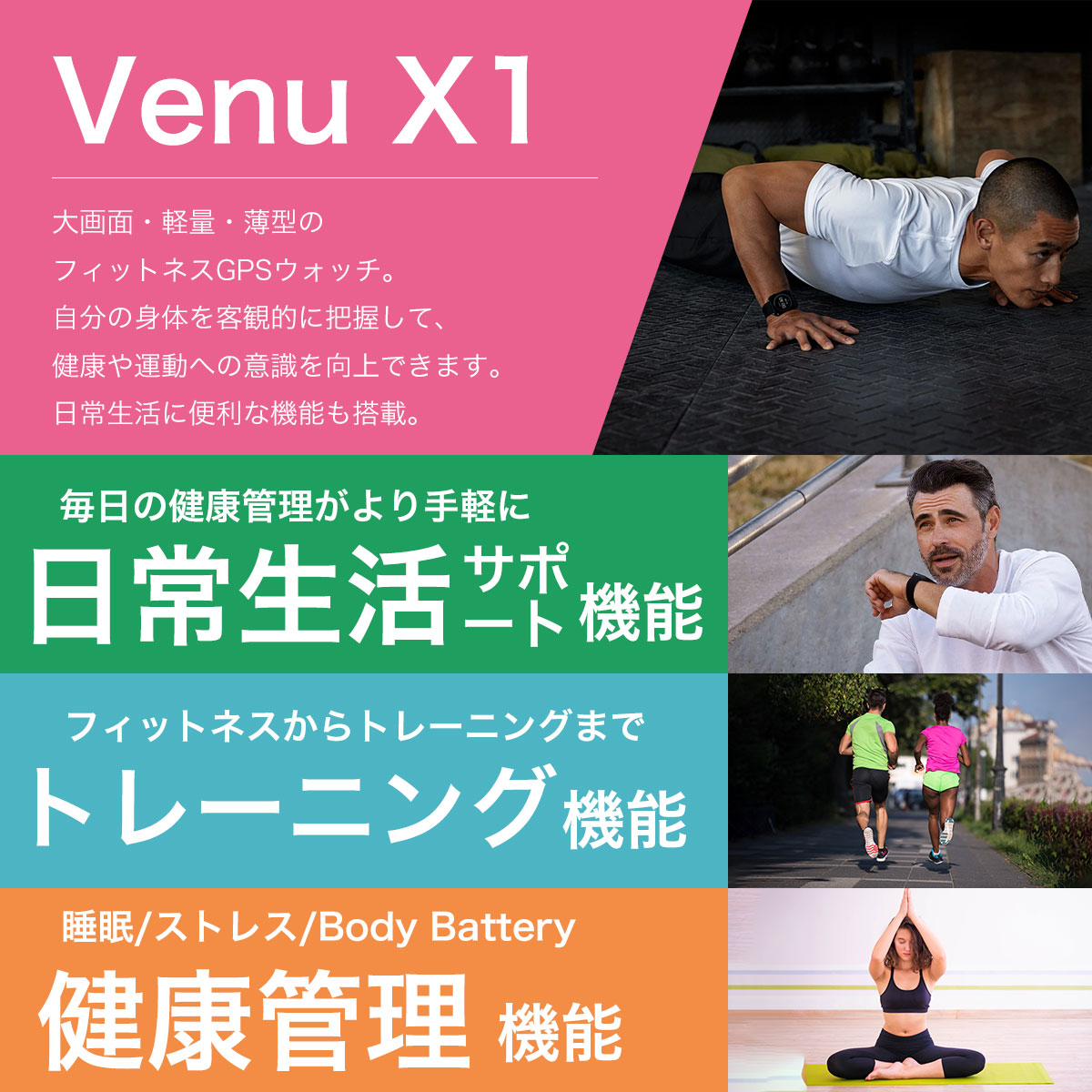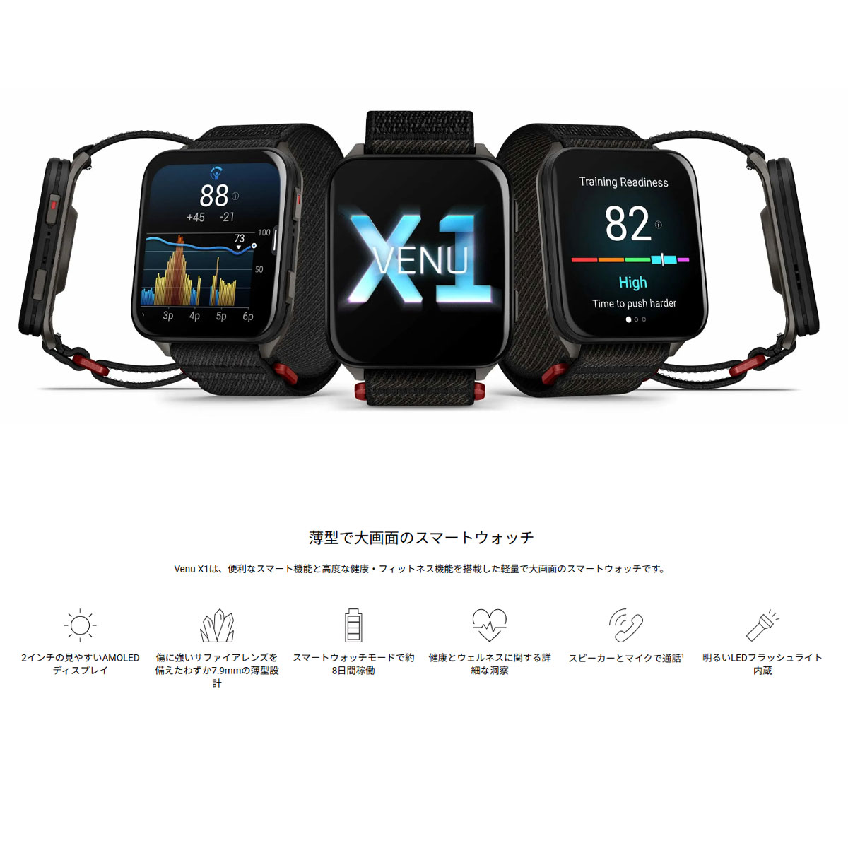 「Venu X1」は、Garmin史上最大のディスプレイ、最薄の7.9mm、重さも40gと、視認性を最大化させつつ、軽量化を実現したモデルです。100種類以上のスポーツアプリや、アウトドアシーンで役立つ地図機能、そして日常をサポートするヘルスケア&スマート機能など、様々なシーンで役立ちます