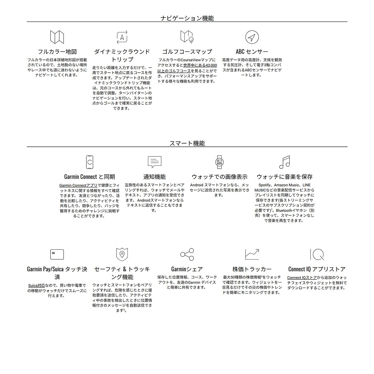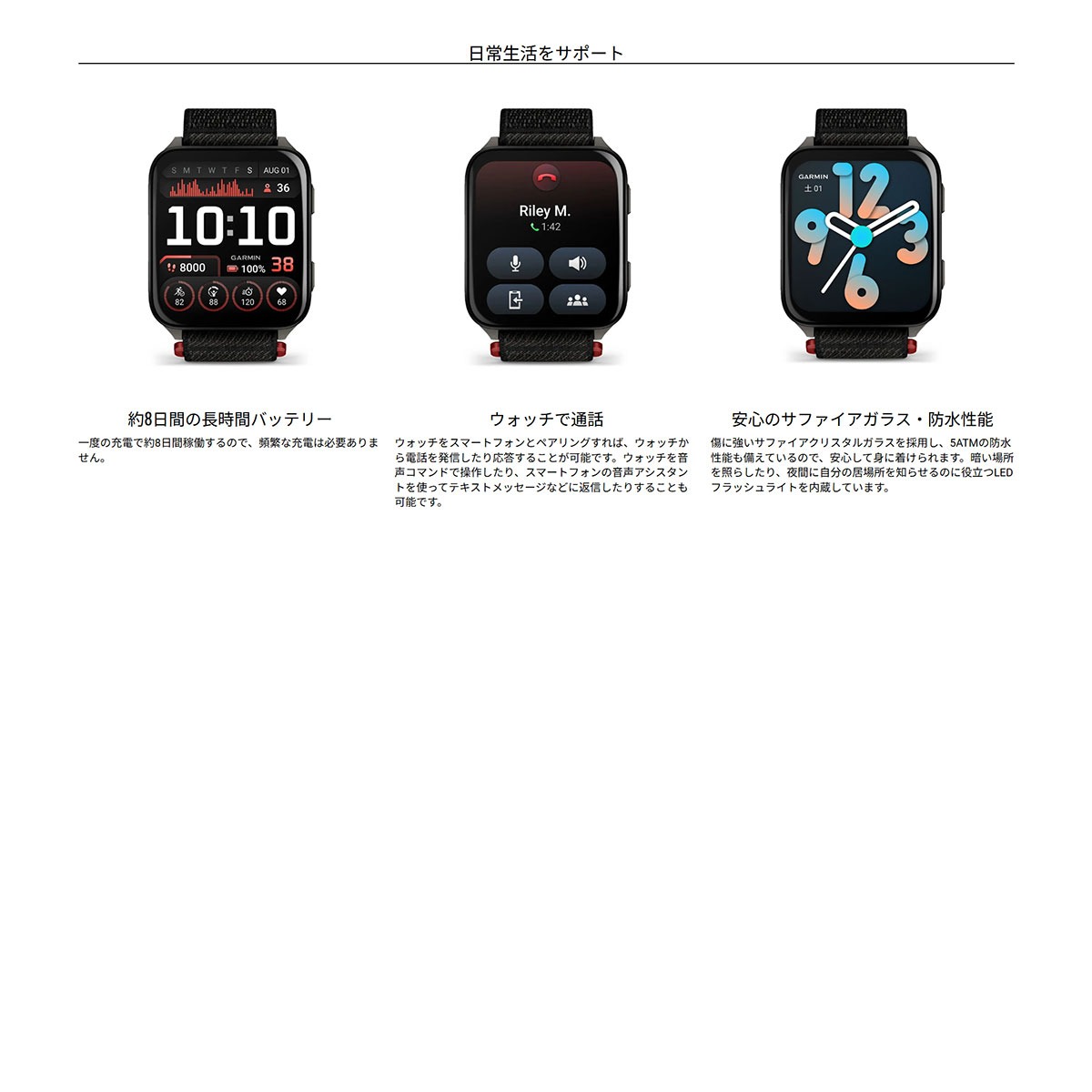 ■スマート機能※3:通知機能、音声アシスタント、テキストメッセージ送信、Suica、音楽機能、スマートフォン検索、セーフティ機能(事故検出・援助要請)など