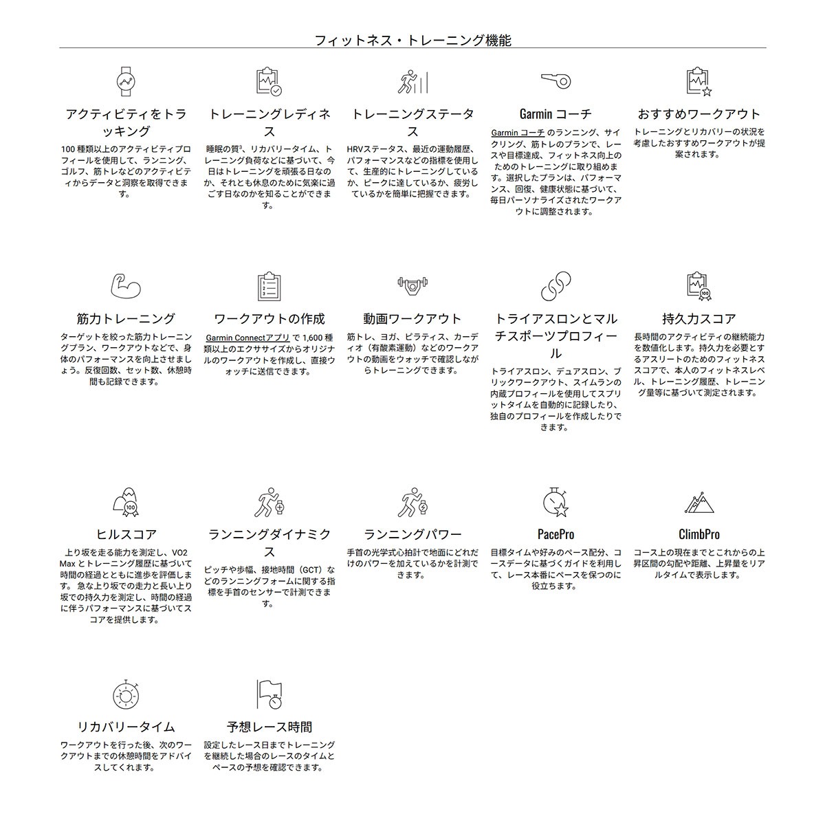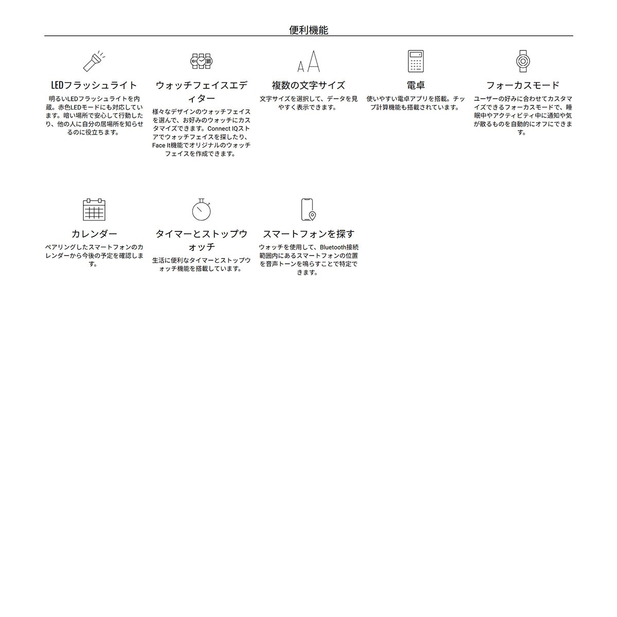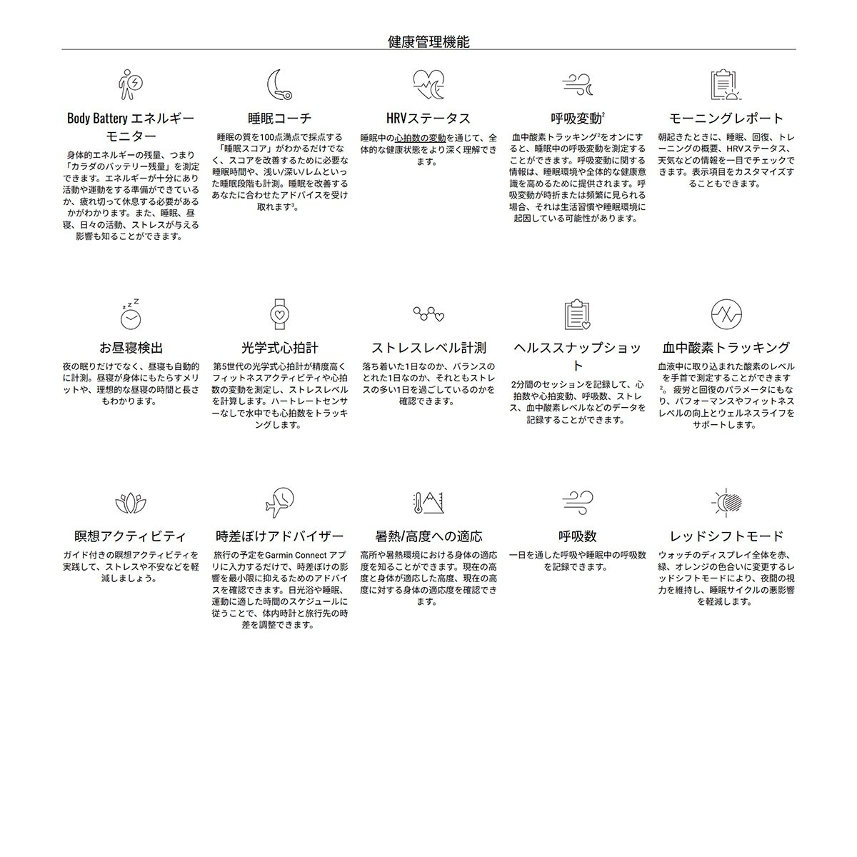 ■ライフログ機能:心拍数、ステップ数、睡眠スコア/睡眠コーチ、ストレスレベル、HRVステータス、フィットネス年齢、Body Battery、皮膚温、消費カロリー、MOVEアラート、上昇階数、週間運動量、水分補給トラッキング、呼吸数、血中酸素トラッキング※2、など