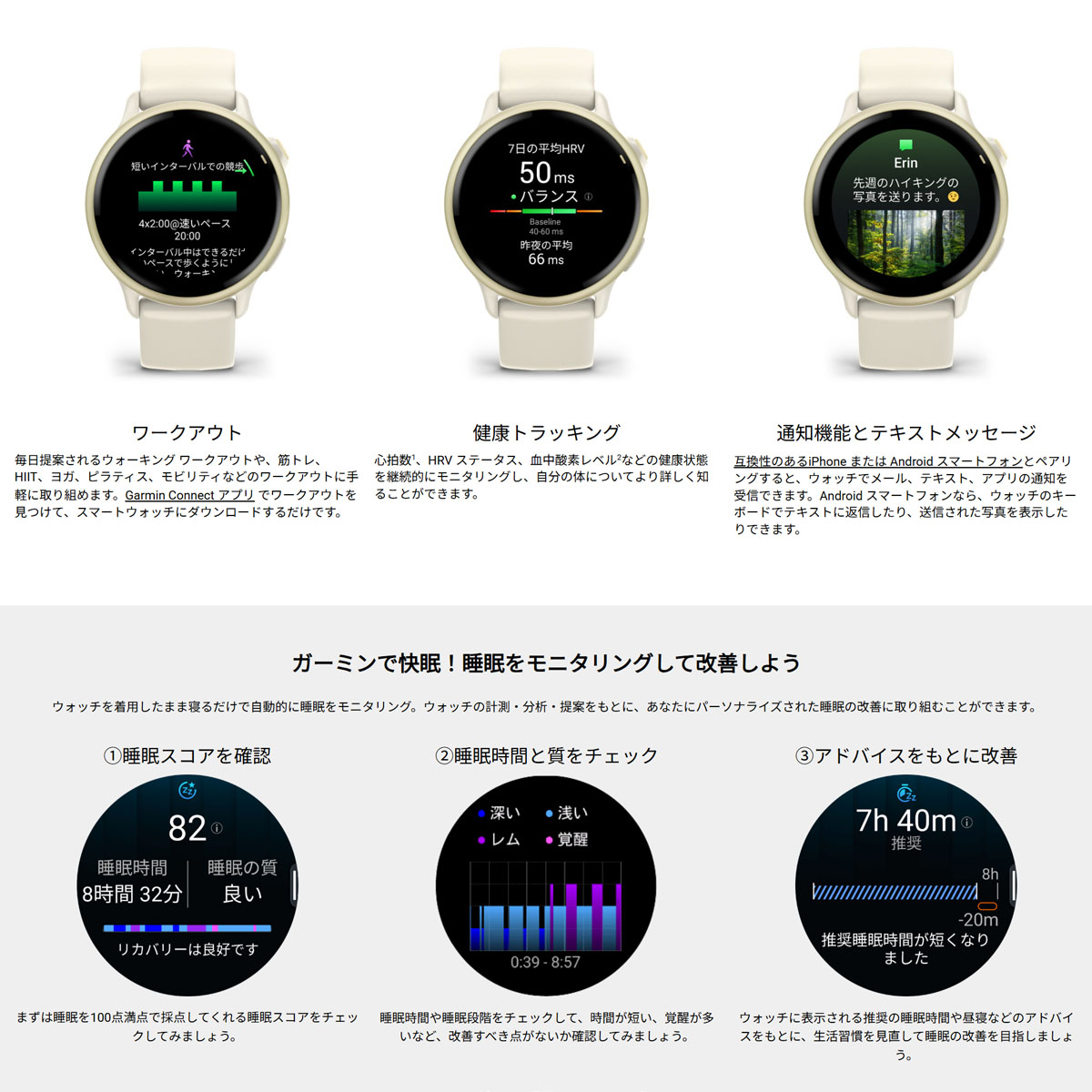 ■ライフログ機能:ステップ数、ステップゴール、距離、消費カロリー、日時表示、Body Battery、生理周期トラッキング、妊娠トラッキング、睡眠スコア、睡眠コーチ、お昼寝検出、週間運動量、呼吸数、ストレスレベル、ヘルススナップショット、血中酸素トラッキング、HRVステータスなど