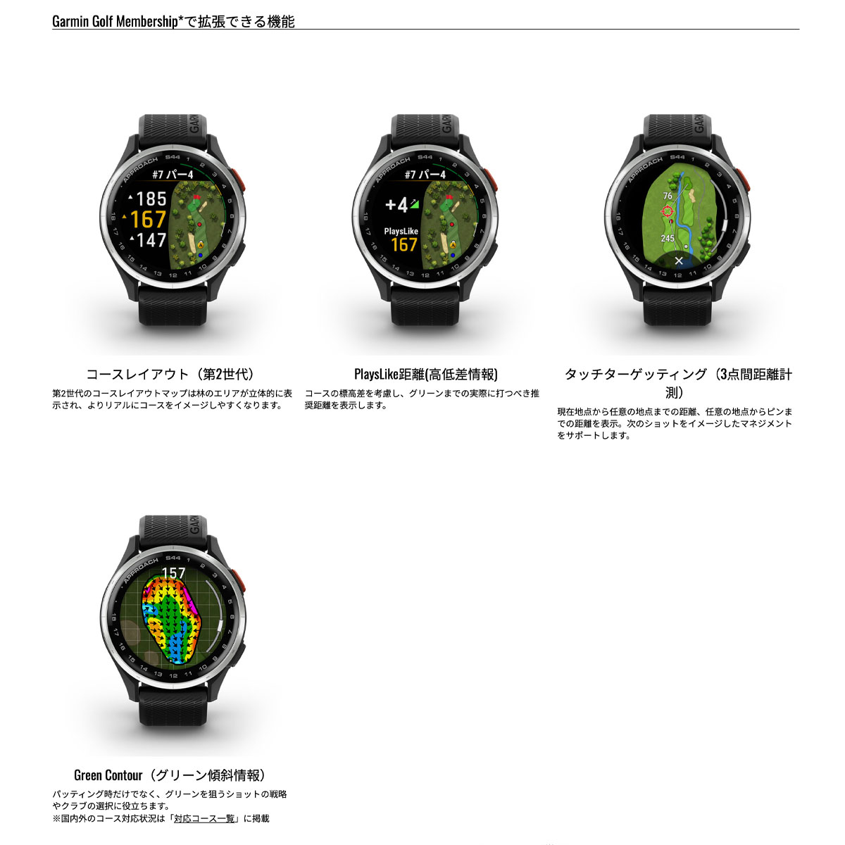 ■その他のゴルフ機能:ラウンド概要(ストローク数、ラウンド毎のパット数、パーオン率、フェアウェイキープ率)、デジタルスコアカード、グリーンまでの距離(フロントエッジ/センター/バックエッジ)、ピンポインター、ガーミンオートショット/ショット飛距離計測、ハザードビュー、グリーンビュー、Green Contour(グリーン傾斜情報)※1、Garmin Golfアプリ対応、クラブセンサーApproach CT10/CT1連携、レーザー距離計Approach Z30連携など