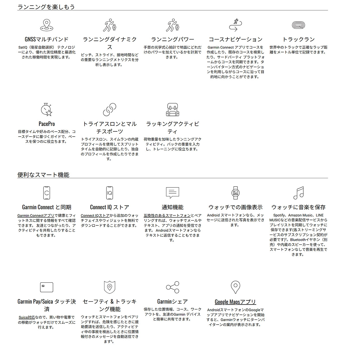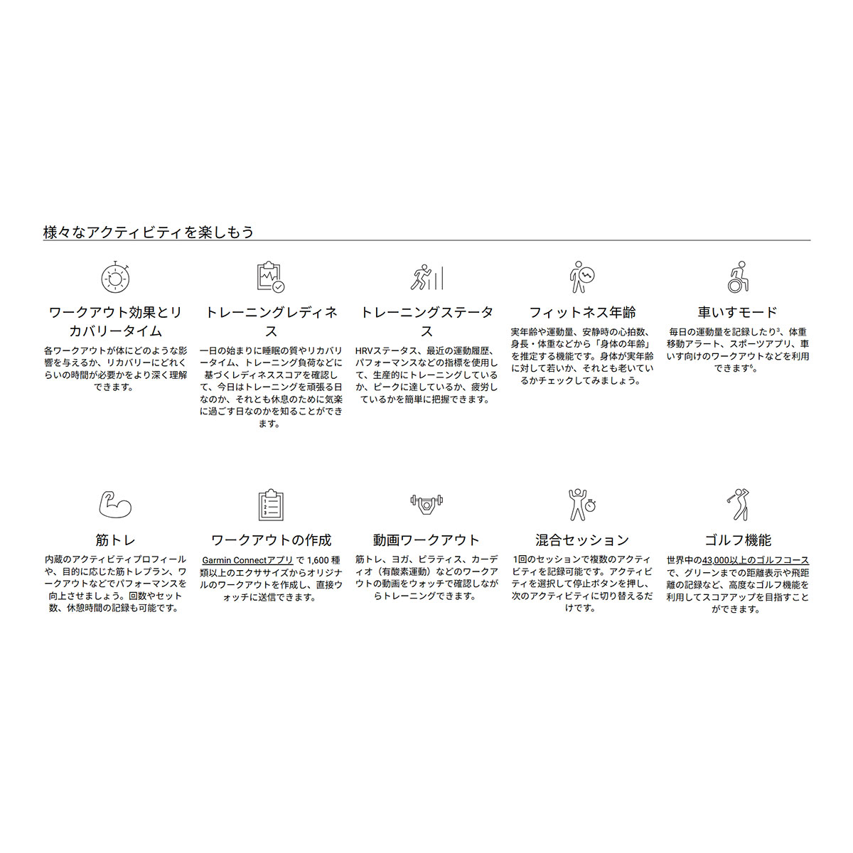 ■トレーニング機能:トレーニングレディネス、トレーニングステータス、パフォーマンスコンディション、乳酸閾値、トレーニング負荷、トレーニング効果、Garminコーチ(フィットネス)、リカバリータイム、おすすめワークアウト(フィットネス)