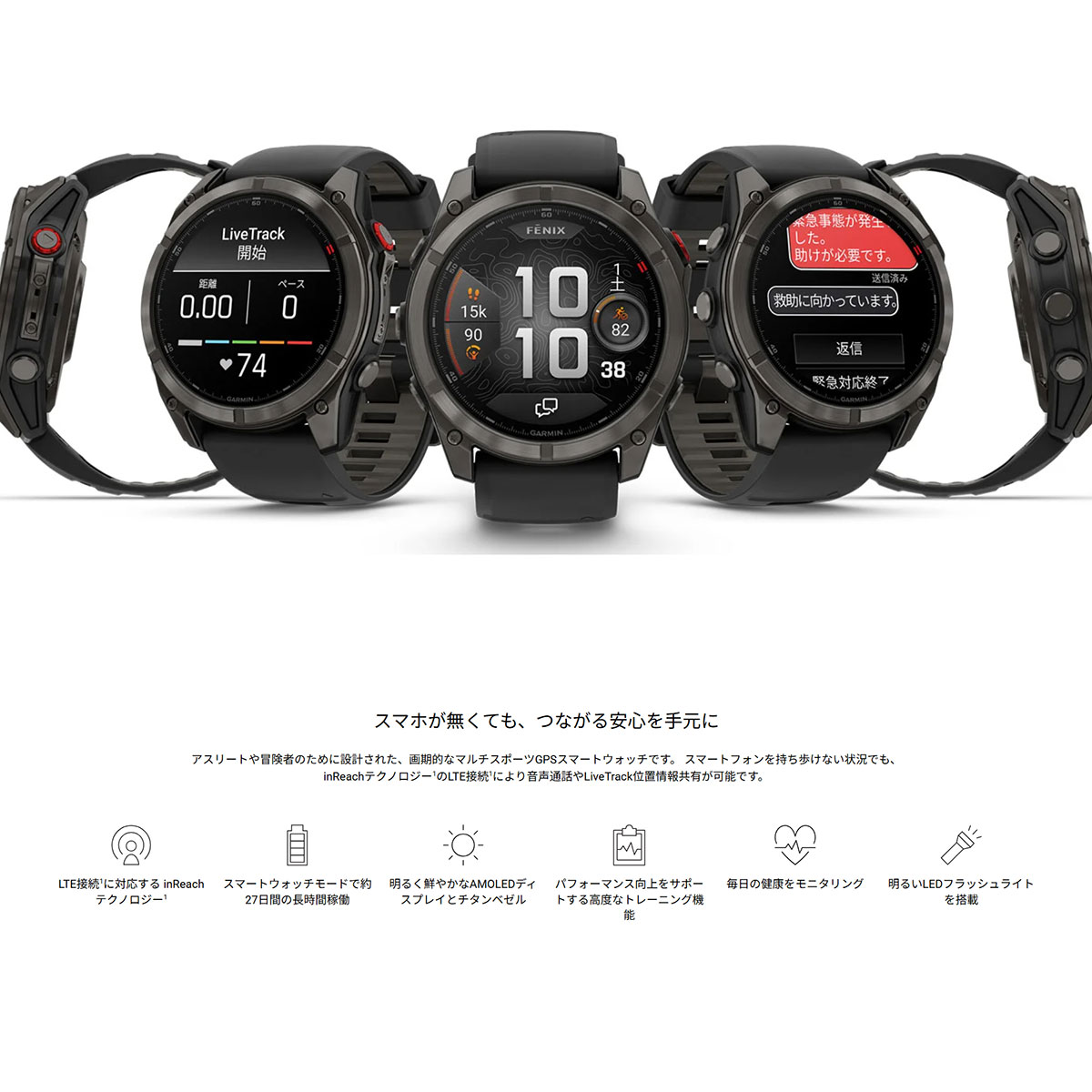 「fenix 8 Pro」シリーズは、Garmin初のinReachテクノロジーを搭載したスマートウォッチ。スマートフォンを持ち歩かなくても、ウォッチ単体で音声通話・メッセージ送受信・位置情報の共有・緊急時のSOS要請が可能。低消費電力のLTE-Mネットワークにより、長時間稼働と広域カバレッジを両立し、日常からアウトドアまで安心の連絡手段を提供します。