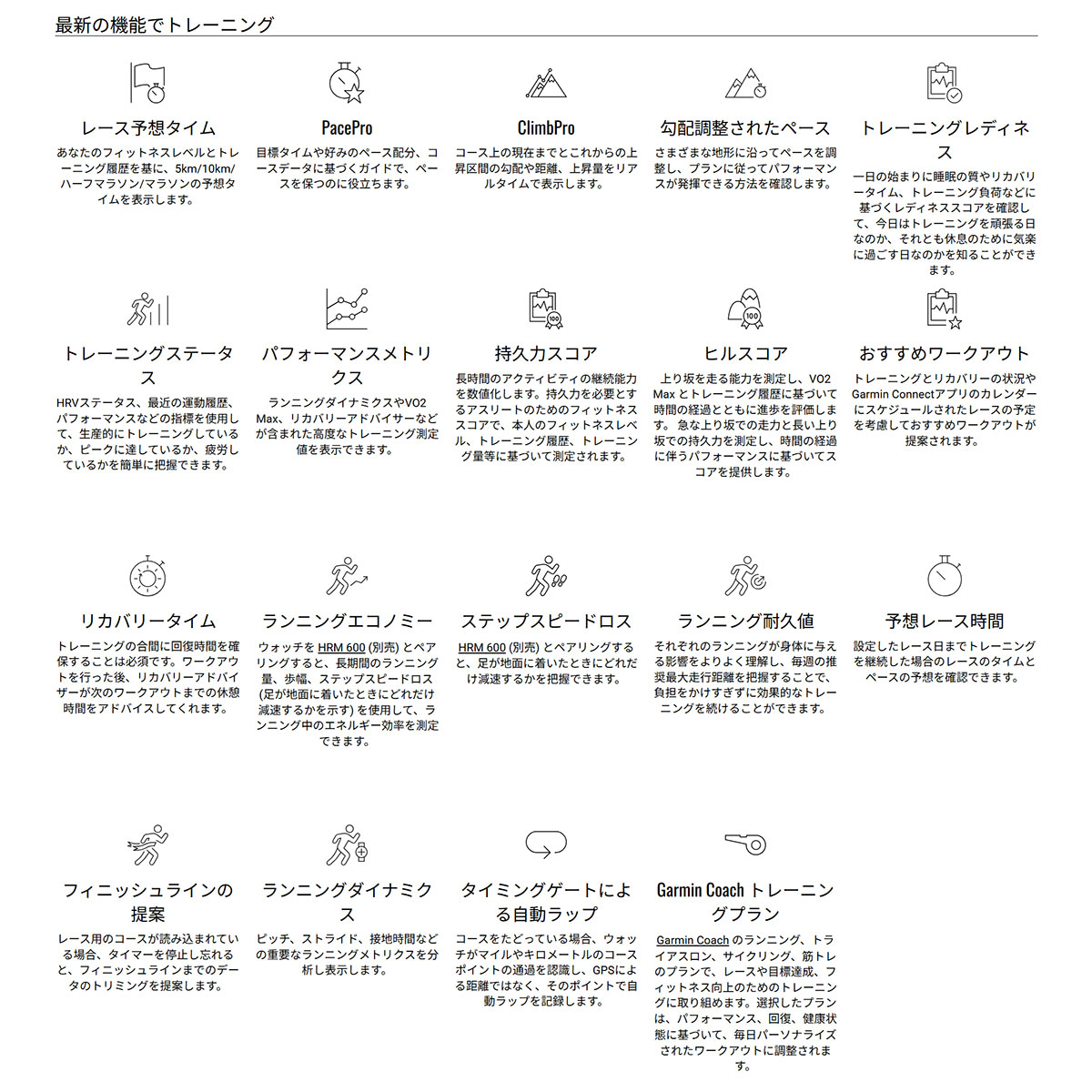 ■スポーツ機能:ランニング、ゴルフ、登山、トレイルラン、バイク、プールスイム、トライアスロン、筋トレ、ボルダリング、スキー、サーフィン、ウィンドサーフィン、SUPなど100種以上のスポーツアクティビティに対応