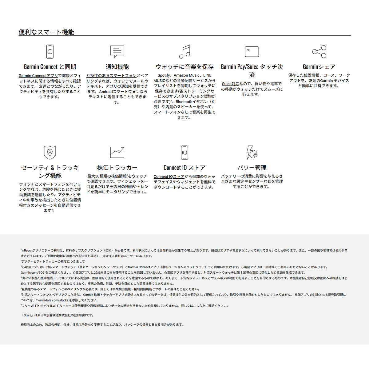 ■スマート機能※5:通知機能、カレンダー、Suica※6、Garmin Pay、天気情報、事故検出機能、スマートフォン検索、音楽再生(Spotify、Amazon Music、LINE Musicに対応)/音楽ストレージ