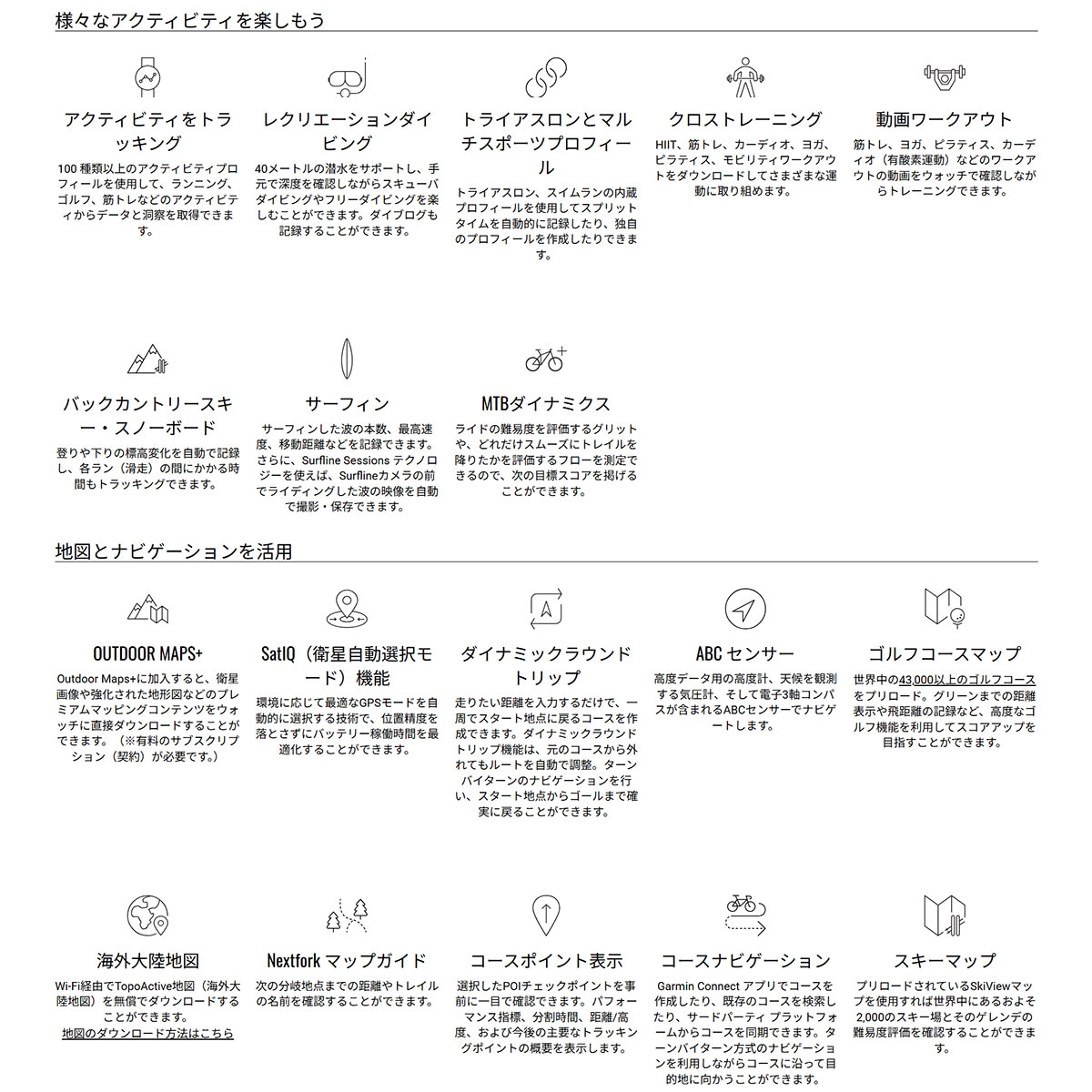 ■スポーツ機能:ランニング、ゴルフ、登山、トレイルラン、バイク、プールスイム、トライアスロン、筋トレ、ボルダリング、スキー、サーフィン、ウィンドサーフィン、SUPなど100種以上のスポーツアクティビティに対応
