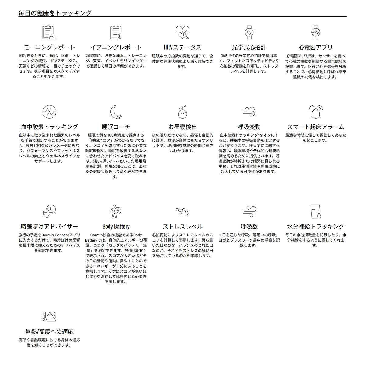 ■ライフログ機能:ステップ、心拍数、Body Battery、ストレスレベル、呼吸数、睡眠スコアつき睡眠モニタリング、血中酸素トラッキング※3、消費カロリー、上昇階数、水分補給トラッキング、フィットネス年齢、週間運動量、心電図※4など
