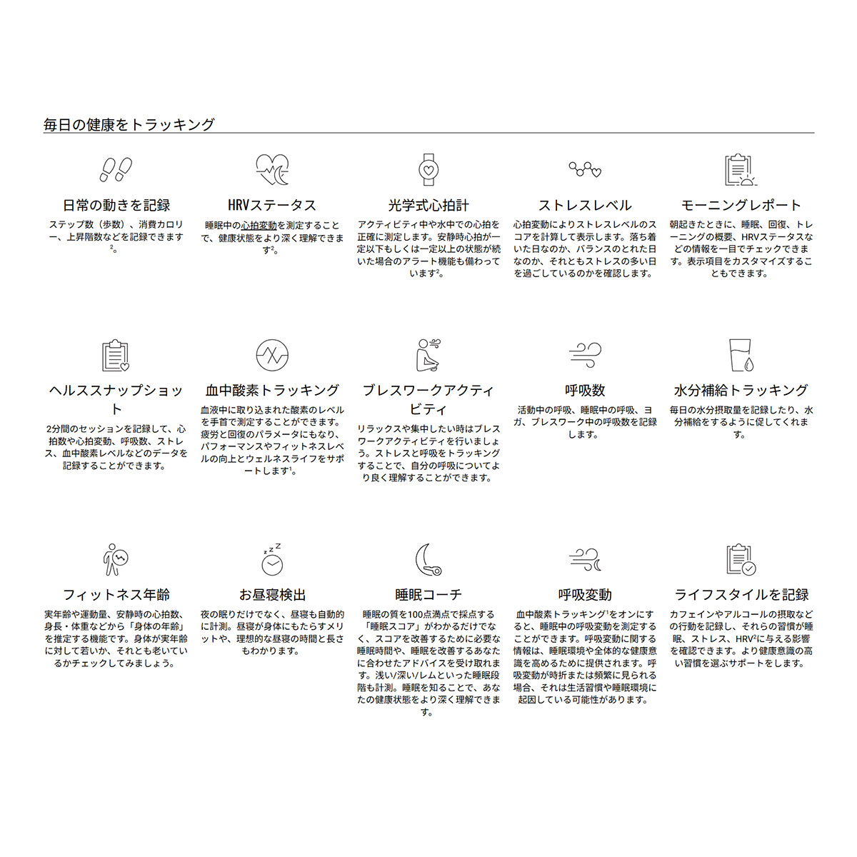 ※3 血中酸素トラッキングは自己診断又は医師への相談をはじめとする医学的な使用を意図するものではなく、疾病の治療・診断・予防を目的とした医療機器ではありません。