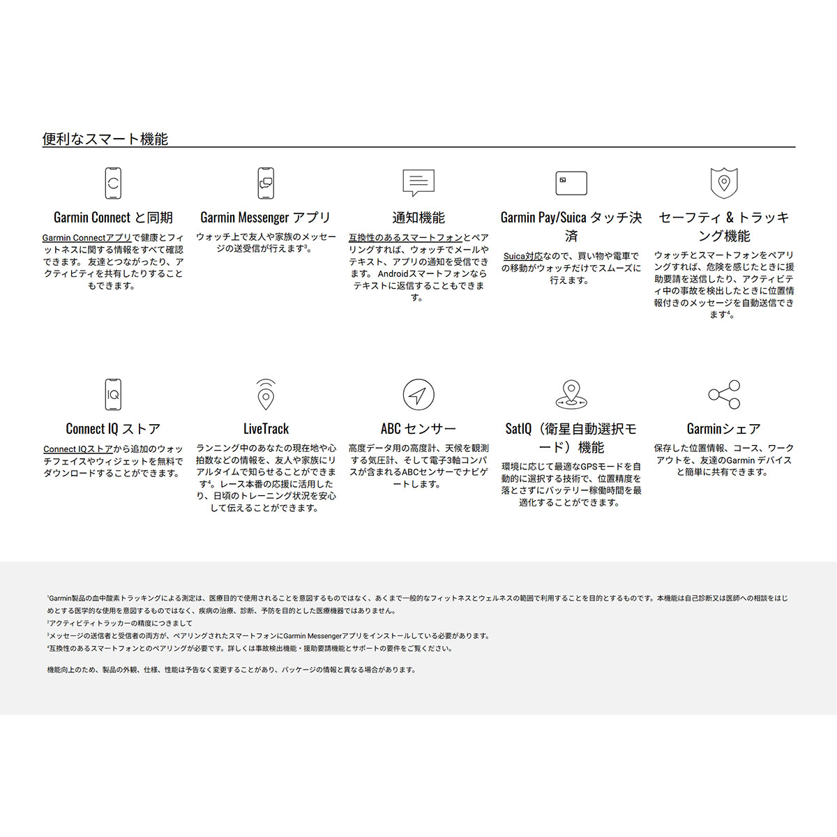 ■その他機能:通知機能、Suica※4、Garmin Pay、天気情報、事故・転倒検出機能、スマホ探索など