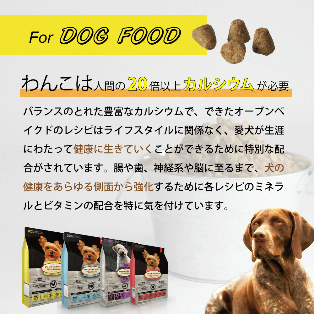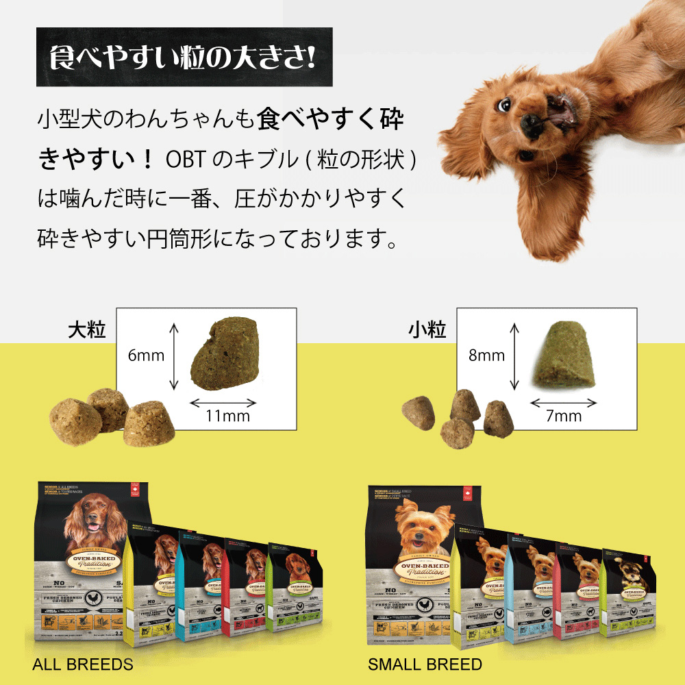 オーブンベークドトラディション(※以下 OBT)は従来のドライフードの製造にかかる時間の、実に10倍の時間をかけて丹念に調理されています。一般によくあるドライフードは製造コストを抑えるために高温で加工することが多く、その結果、栄養分は破壊されてしまいます。OBTは低温でじっくりと時間をかけることで、香り・風味・栄養分を損なうことなく保持することが可能となりました。「オーブンベークド製法」は粒がカチカチに硬くなることがなく、 簡単に噛み砕けて、消化吸収に優れています。さらに当商品はセミモイストにすることにより、シニア犬、グルメなわんちゃんに配慮しております。