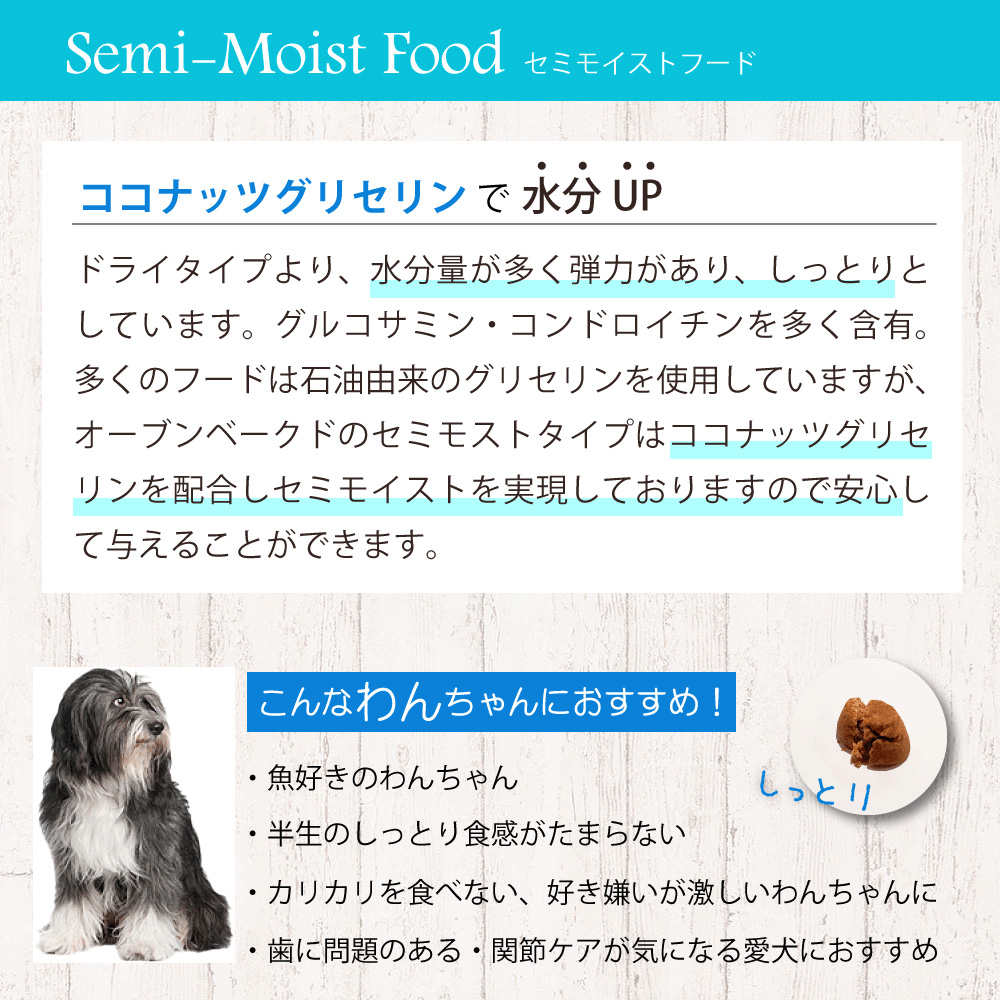 オーブンベークドよりセミモイスト(半生)が登場!ドライタイプより、水分量が多く弾力があり、しっとりとしています。グルコサミン・コンドロイチンを多く含有。関節ケアが気になる愛犬に。多くのフードは石油由来のグリセリンを使用していますが、オーブンベークドのセミモストタイプはココナッツグリセリンを配合しセミモイストを実現しておりますので安心して与えることができます。嗜好性が高いので、カリカリを食べない、好き嫌いが激しいわんちゃんなどにオススメです。■粒の大きさ(約):横1.2cm×縦0.9cm