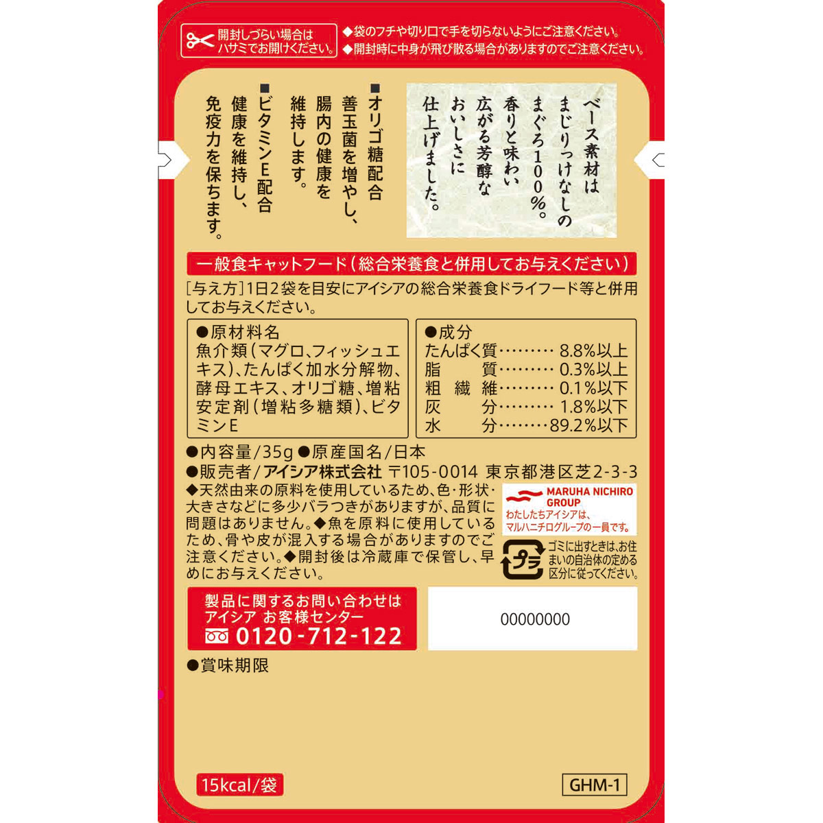 | 原材料 | 魚介類(マグロ、フィッシュエキス)、たんぱく加水分解物、酵母エキス、オリゴ糖、増粘安定剤(増粘多糖類)、ビタミンE |