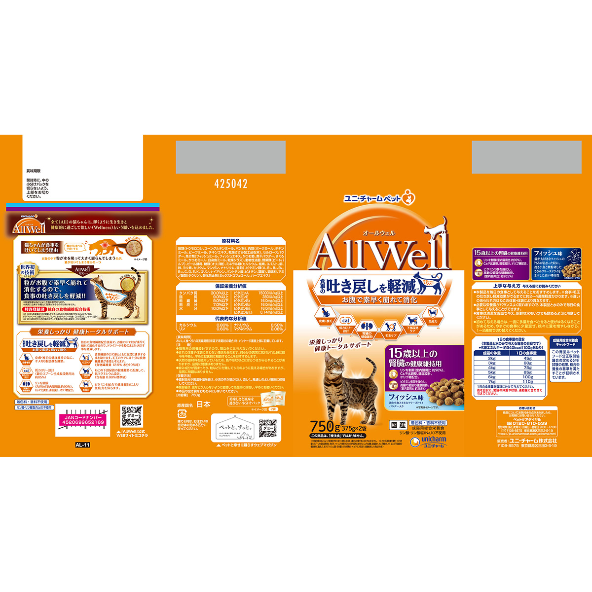 AllWell オールウェル キャットフード 15歳以上の腎臓の健康維持用 フィッシュ味 挽き小魚とささみフリーズドライパウダー入り 750g×9個