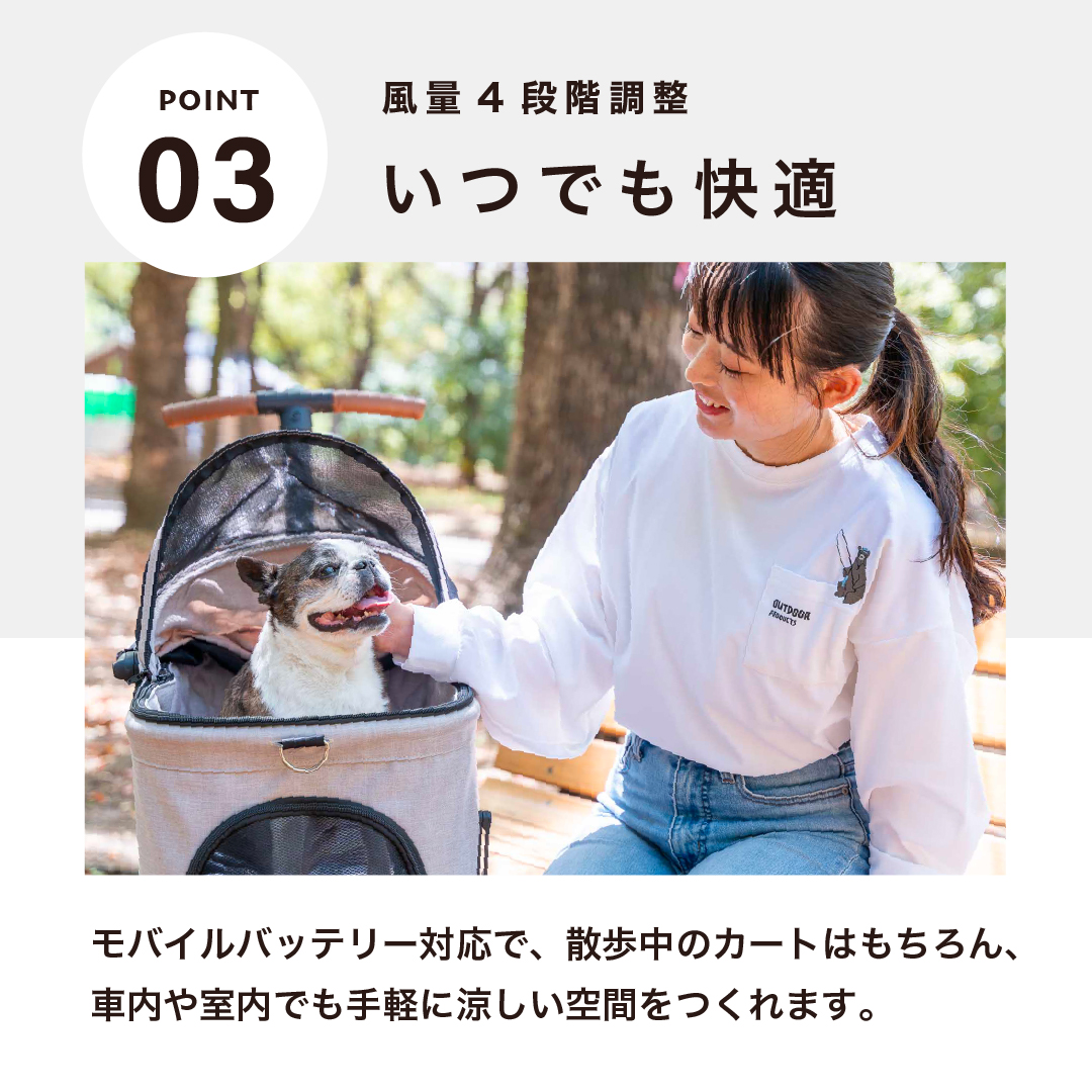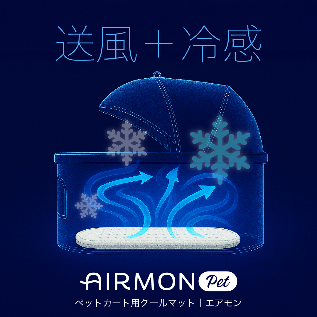 ペットカート用送風型クールマット『エアモン・ペット』!冷やすのではなく、空気を動かすという新発想で、熱中が心配な季節に、安心できる暑さ対策を提供するペットカート用送風型クールマットです。