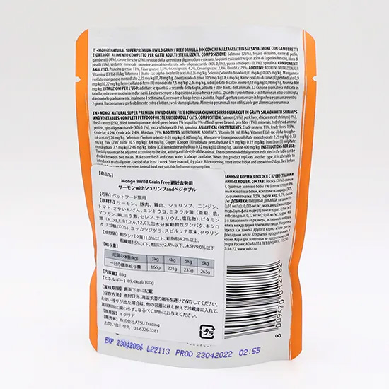 | 原材料 | サーモン、豚肉、シュリンプ、ニンジン、トマト、さやいんげん、エンドウ豆、ミネラル類(亜鉛、鉄、マンガン、銅、ヨウ素、セレン、ナトリウム、塩化物)、ビタミン(AD3、E、 81.2.6.12、C)、加水分解動物性タンパク、キシロオリゴ糖(XOS)、ユッカシジゲラ、スピルリナ原末 |