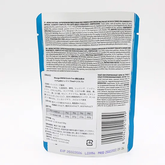 | 原材料 | マグロ、七面鳥肉、豚肉、シュリンプ、ニンジン、トマト、さやいんげん、エンドウ豆、ミネラル類(亜鉛、鉄、マンガン、銅、ヨウ素、セレン、ナトリウム、塩化物)、ビタミン(AD3、E、 81.2.6.12、C)、加水分解動物性タンパク、キシロオリゴ糖(XOS)、ユッカシジゲラ、スピルリナ原末 |
