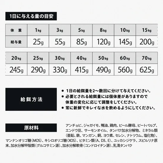 成分値 粗タンパク質:31%以上、粗脂肪:20%以上、粗繊維:2%以下、粗灰分:7%以下、水分:8%以下、カルシウム:1.5%以上、リン:1.2%以上、オメガ6(必須脂肪酸):3.5%以上、オメガ3(必須脂肪酸):0.9%以上