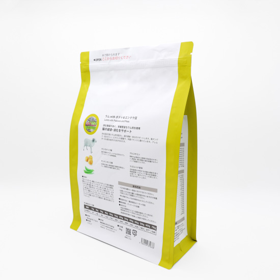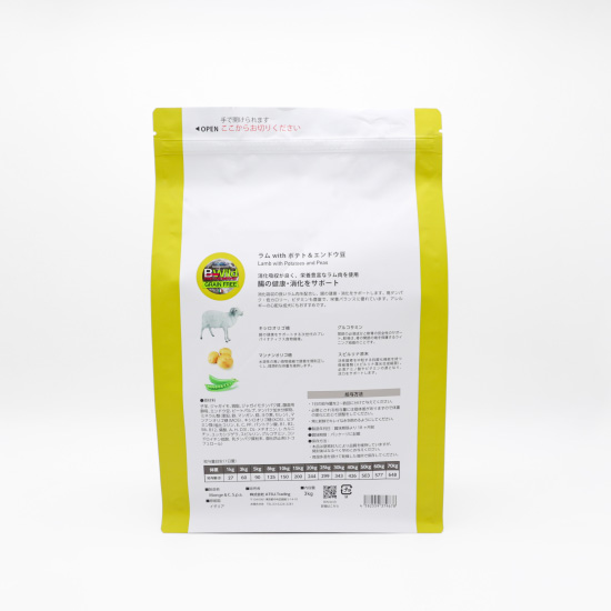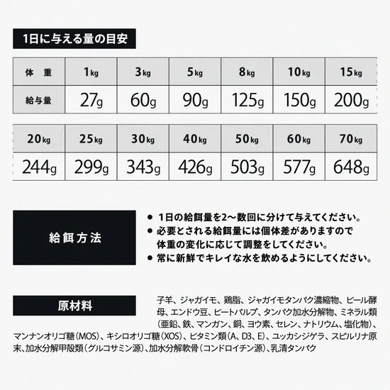 子羊、ジャガイモ、鶏脂、ジャガイモタンパク濃縮物、ビール酵母、エンドウ豆、ビートパルプ、タンパク加水分解物、ミネラル類(亜鉛、鉄、マンガン、銅、ヨウ素、セレン、ナトリウム、塩化物)、マンナンオリゴ糖(MOS)、キシロオリゴ糖(XOS)、ビタミン類(A、D3、E)、ユッカシジゲラ、スピルリナ原末、加水分解甲殻類(グルコサミン源)、加水分解軟骨(コンドロイチン源)、乳清タンパク、自然保存料酸化防止剤(トコフェロール)