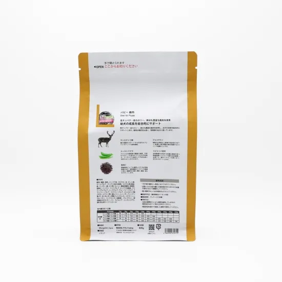 鹿肉、鶏脂、鶏肉、エンドウ豆、タピオカ、米、オーツ麦、ビートパルプ、タンパク加水分解物、ミネラル類(亜鉛、鉄、マンガン、銅、ヨウ素、セレン、ナトリウム、塩化物)、ビール酵母、乾燥卵、亜麻仁、ニンジン、トマトパルプ、パイナップルパルプ、りんごパルプ、ブルーベリーパルプ、クランベリーパルプ、ラズベリーパルプ、キシロオリゴ糖(XOS)、ビタミン類(A、D3、E)、加水分解軟骨(コンドロイチン源)、加水分解甲殻類(グルコサミン源)、加水分解酵母(MOS源)、スピルリナ原末、ユッカシジゲラ、自然保存料酸化防止剤(トコフェロール)