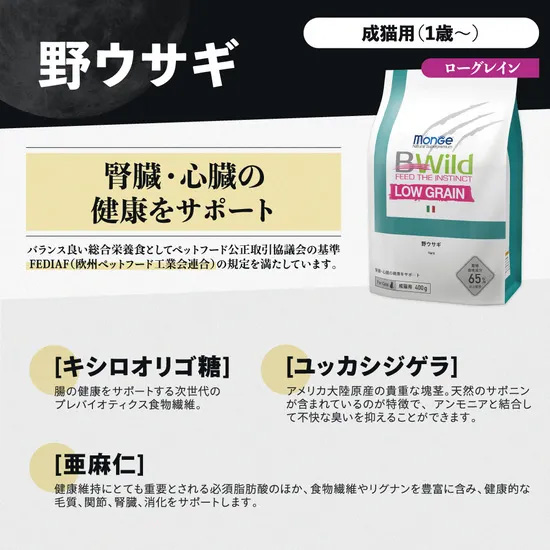 野ウサギの肉に多く含まれるカリウムやマグネシウムが、成猫の腎臓や心臓の健康をサポートします。 高タンパク・低カロリーに加え、希少で柔らかい肉質により嗜好性の高いフードです。スーパーフードや様々なフルーツと野菜のミックスB Wild “Feed the instinct”は、猫の自然な本能に沿った食事を与えるために考案した革新的なラインです。動物由来の原材料に加え、厳選された機能性成分、スーパーフード、フルーツや野菜などが配合されています。栄養特性や動物の生理機能をサポートするために厳選されたものが配合されています。