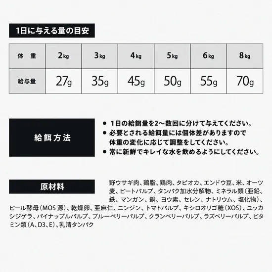 野ウサギ肉、鶏脂、鶏肉、タピオカ、エンドウ豆、米、オーツ麦、ビートパルプ、タンパク加水分解物、ミネラル類(亜鉛、鉄、マンガン、銅、ヨウ素、セレン、ナトリウム、塩化物)、ビール酵母(MOS源)、乾燥卵、亜麻仁、ニンジン、トマトパルプ、キシロオリゴ糖(XOS)、ユッカシジゲラ、パイナップルパルプ、ブルーベリーパルプ、クランベリーパルプ、ラズベリーパルプ、ビタミン類(A、D3、E)、乳清タンパク、自然保存料酸化防止剤(トコフェロール)