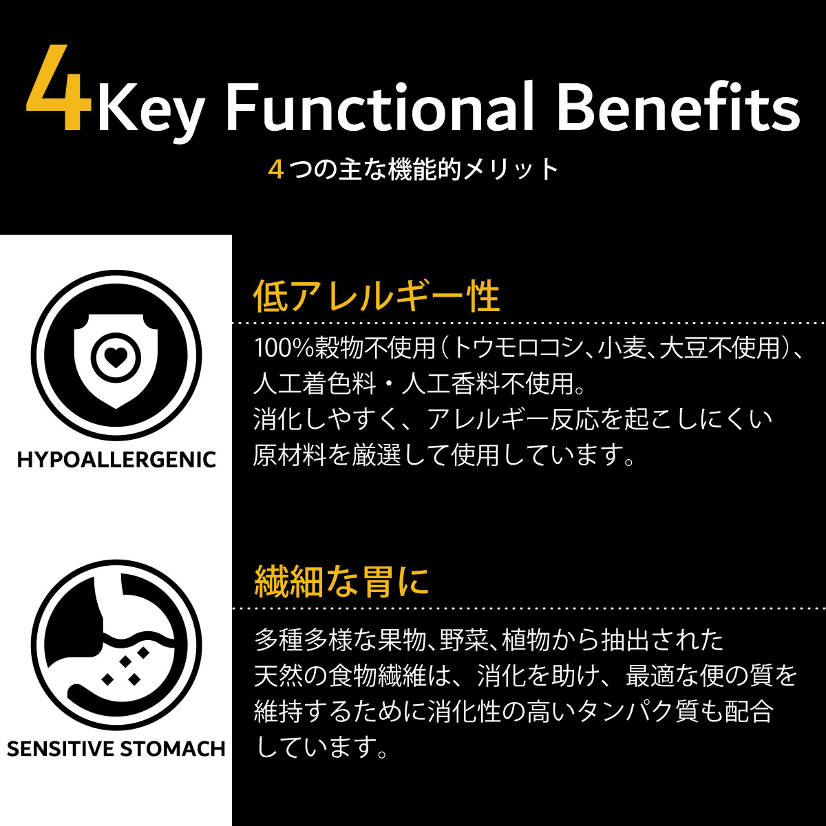 繊細なお腹に:様々な種類の果物や野菜、ハーブから得られる天然プレバイオティクスである繊維が、消化器官の健康を促進します。また、最適な便の状態を維持するための消化しやすいタンパク質も配合しています。