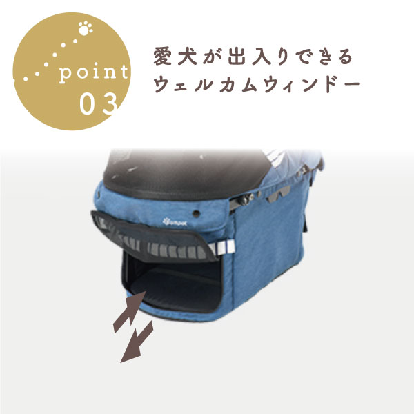 床置き使用時にはキャリー前部のウェルカムウィンドーを開けば、ワンちゃんの自由な出入口に。