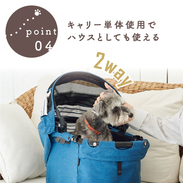 ミリミリ EG ロング Dのキャリー部分は車体から取り外して単体でも使用できます。さらに、床置き使用時には前部のウェルカムウィンドーを開くと、ワンちゃんが自由に出入りでき、お出かけ先などでハウスとして使うこともできます。