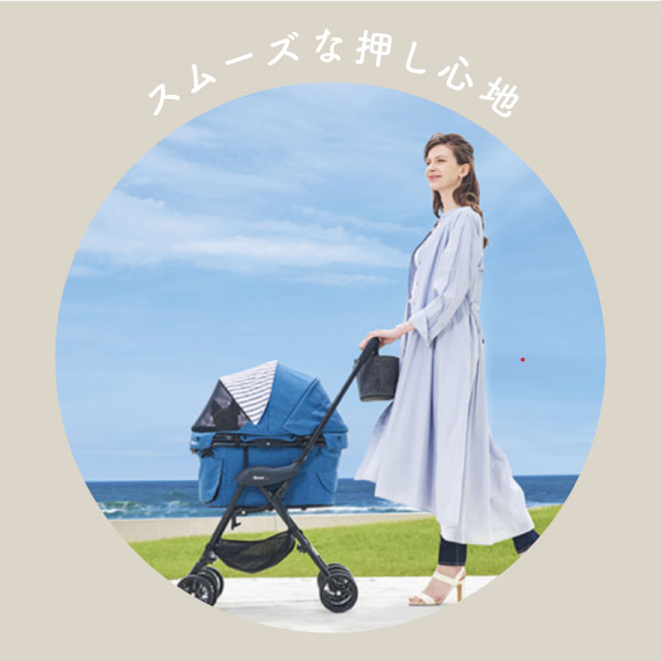 この「エッグショック」をペットカートにも採用し、走行時の振動や衝撃を減らして、愛犬も快適なお出かけができます。