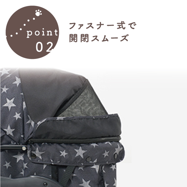 幌の開口部はファスナー式でスムーズに開閉でき、小さなペットの抜け出しが防止できます。