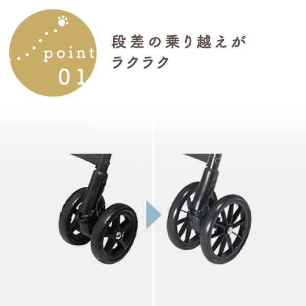 この「エッグショック」をペットカートにも採用し、走行時の振動や衝撃を減らして、愛犬も快適なお出かけができます。