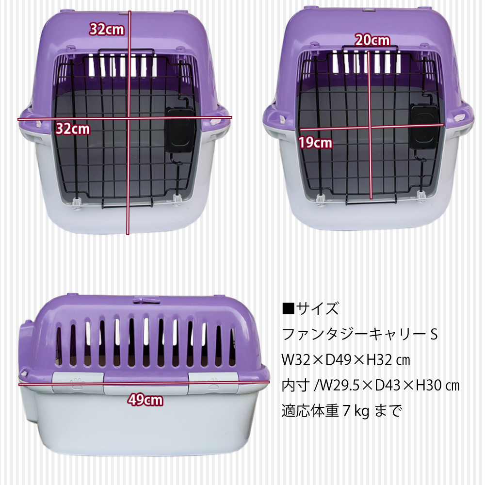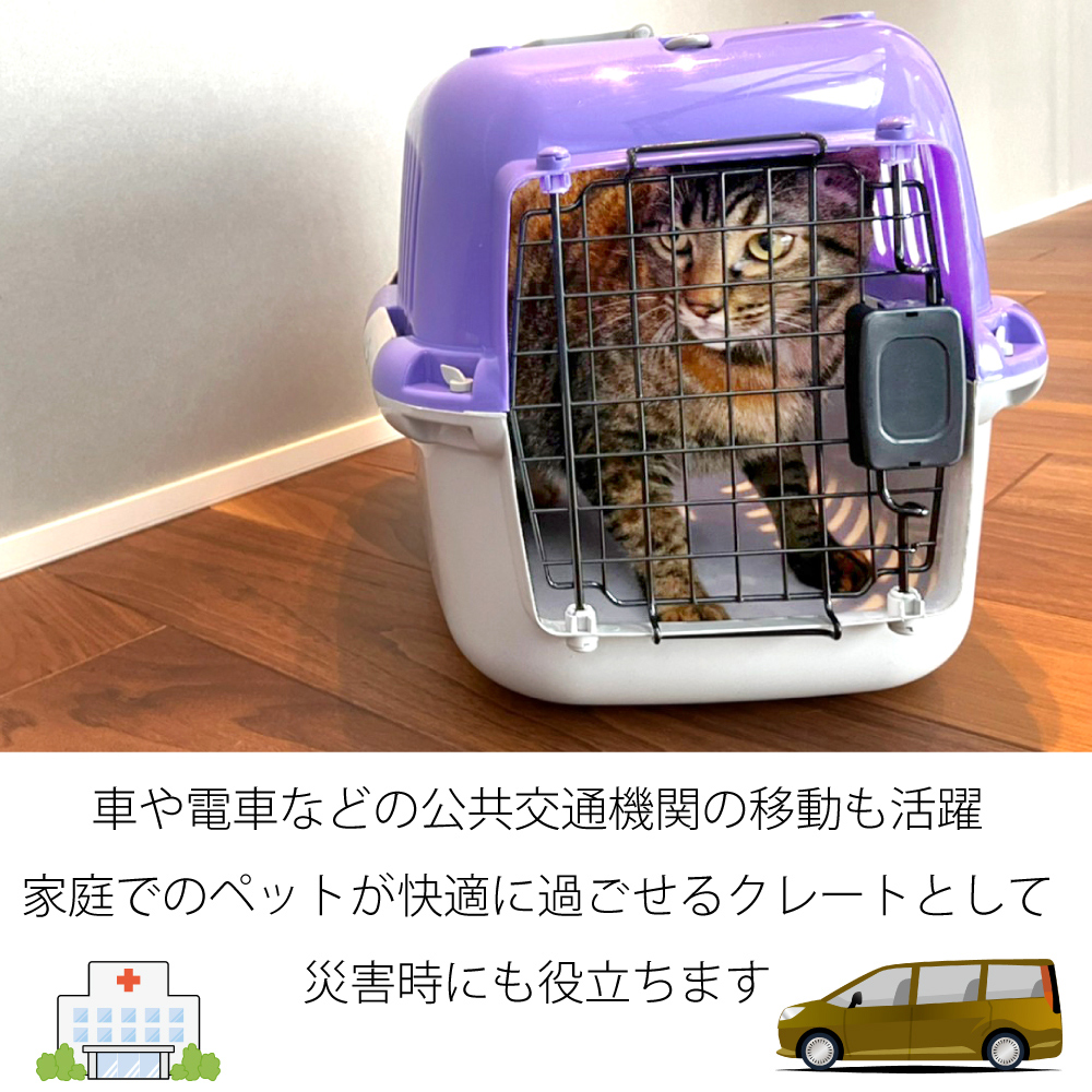 おでかけ、通院、ドライブ、ハウス、旅行などいろいろなシーンで大活躍。使いやすさにこだわったシンプル設計でありながら欲しかった機能性は抜群。車載した時にシートベルトを通して固定できます。扉は格子状になっているので、中がよく見え、ペットにおやつをあげたり、中の様子も確認できます。通気性が優れているので熱がこもりにくくなっております。プラスチック製なので丈夫で軽量です。お手入れ簡単で、衛生的。汚れてもすぐ洗うことができ、ふき取るだけて乾きます。