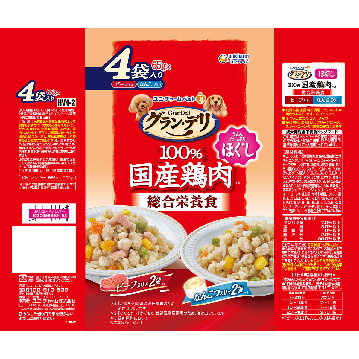 グラン・デリ ドッグフード 100%国産鶏肉パウチ 総合栄養食 ほぐし 成犬用 なんこつ入り&ビーフ入り