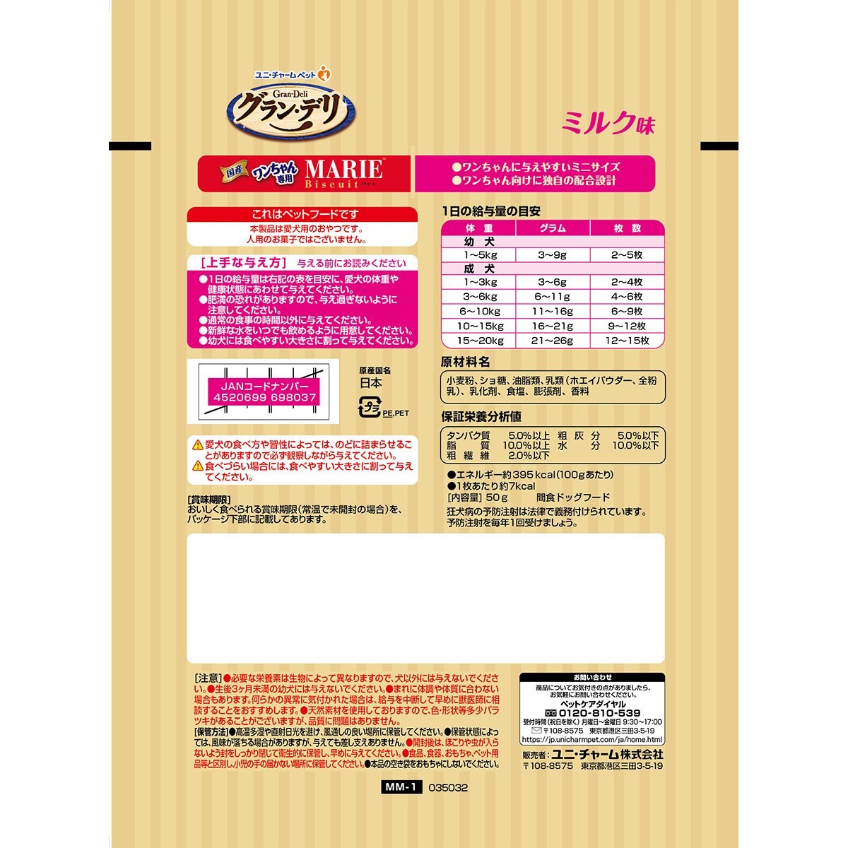 ユニ・チャームペット×森永製菓の共同開発!ワンちゃん専用「マリービスケット」です。ワンちゃん向けに配合に調整し、優しいミルクの味わいを実現しました。人間用のマリービスケットよりも小さいサイズで与えやすい。