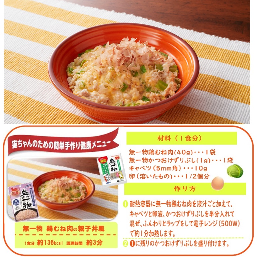 原材料は、素材と天然水だけ。食品添加物・飼料添加物を加えずに、鶏むね肉本来の旨みをたっぷり味わえるよう、鶏むね肉と水だけで作ったキャットフードです。