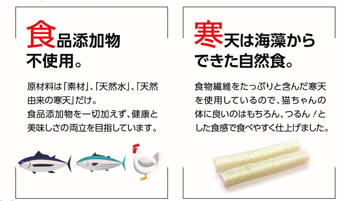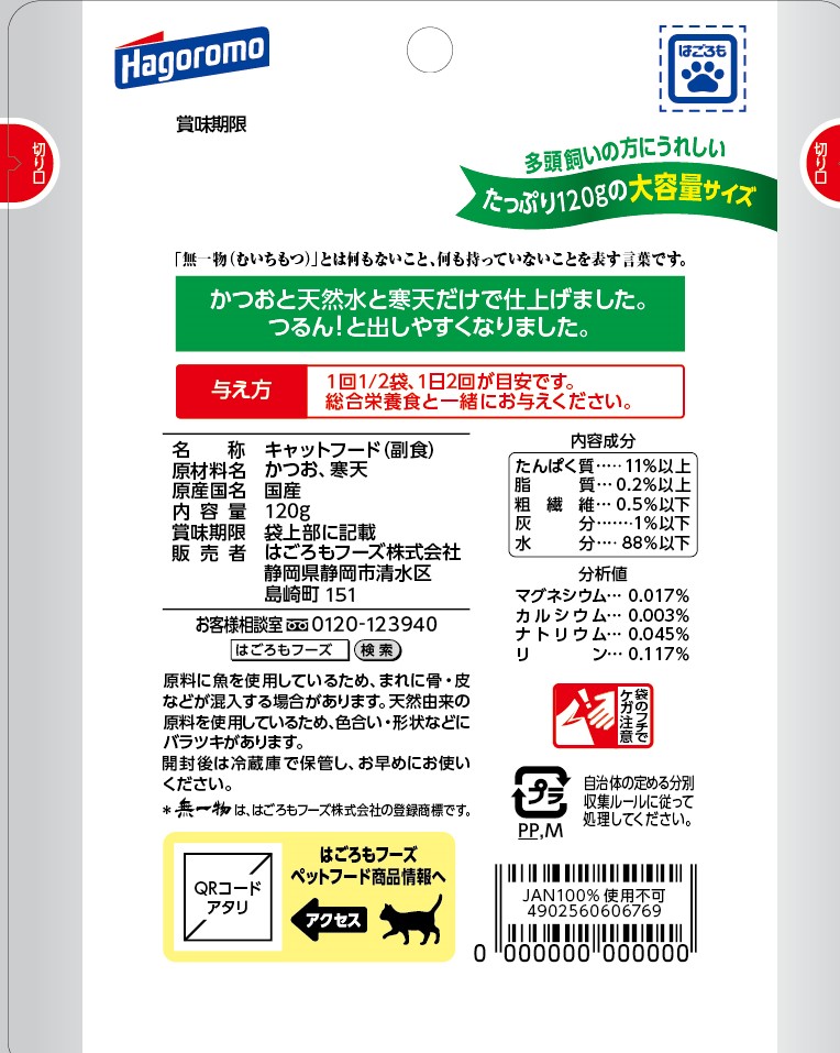 多頭飼いの方に嬉しいたっぷり120gの大容量サイズ。原材料は「かつお」「天然水」「天然由来の寒天」だけ。食品添加物を一切加えず、健康とおいしさの両立を目指します。食物繊維をたっぷり含んだ寒天を使用しているので、猫ちゃんのからだに良いのはもちろん、つるん!とした食感で食べやすく仕上げました。パウチから出すときもつるん!と取り出しやすいです。
