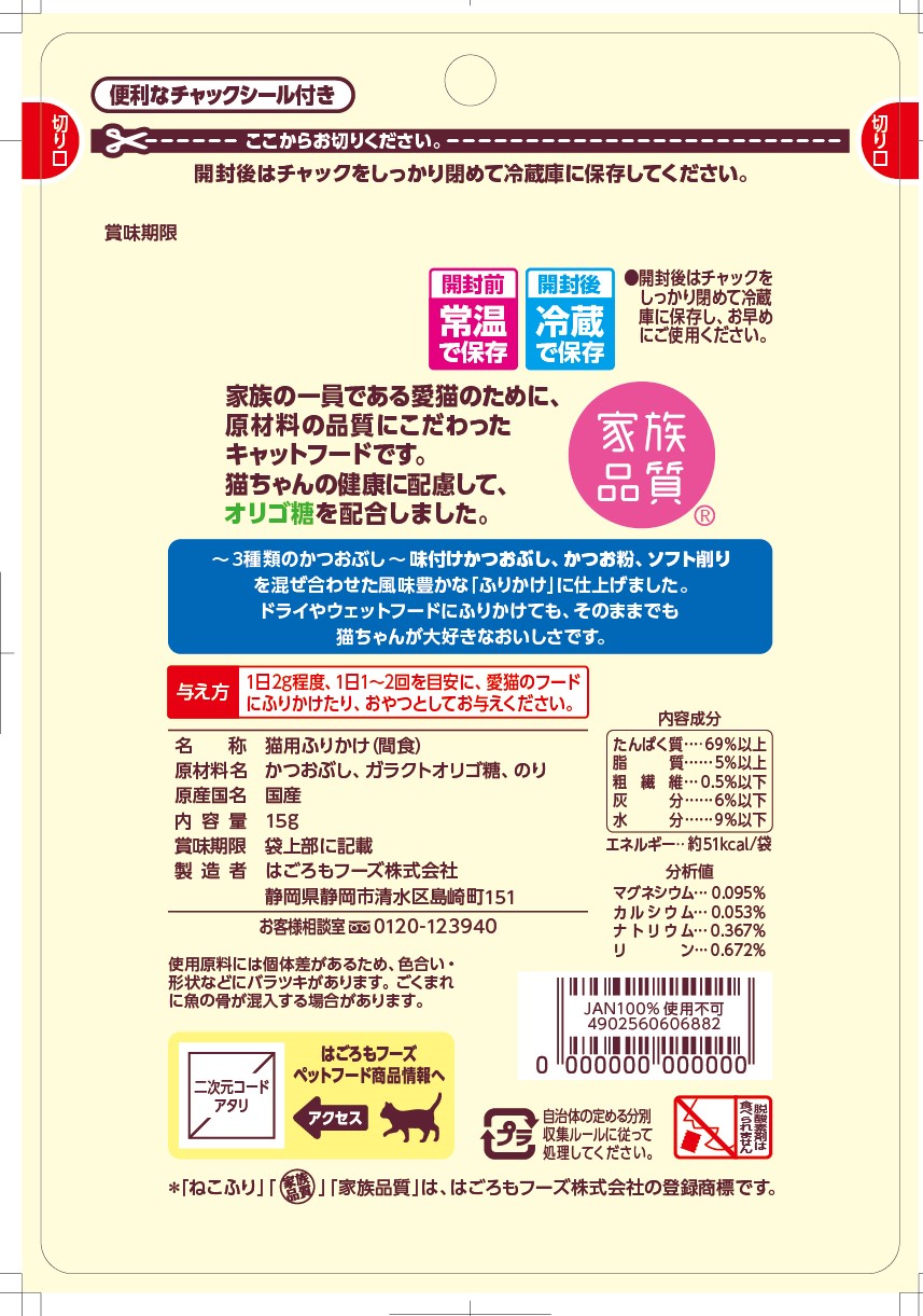 ~3種類のかつおぶし~味付けかつおぶし、かつお粉、ソフト削りを混ぜ合わせた風味豊かな「ふりかけ」に仕上げました。ドライ&ウェットフードにふりかけても、そのままでも猫ちゃんが大好きなおいしさです。