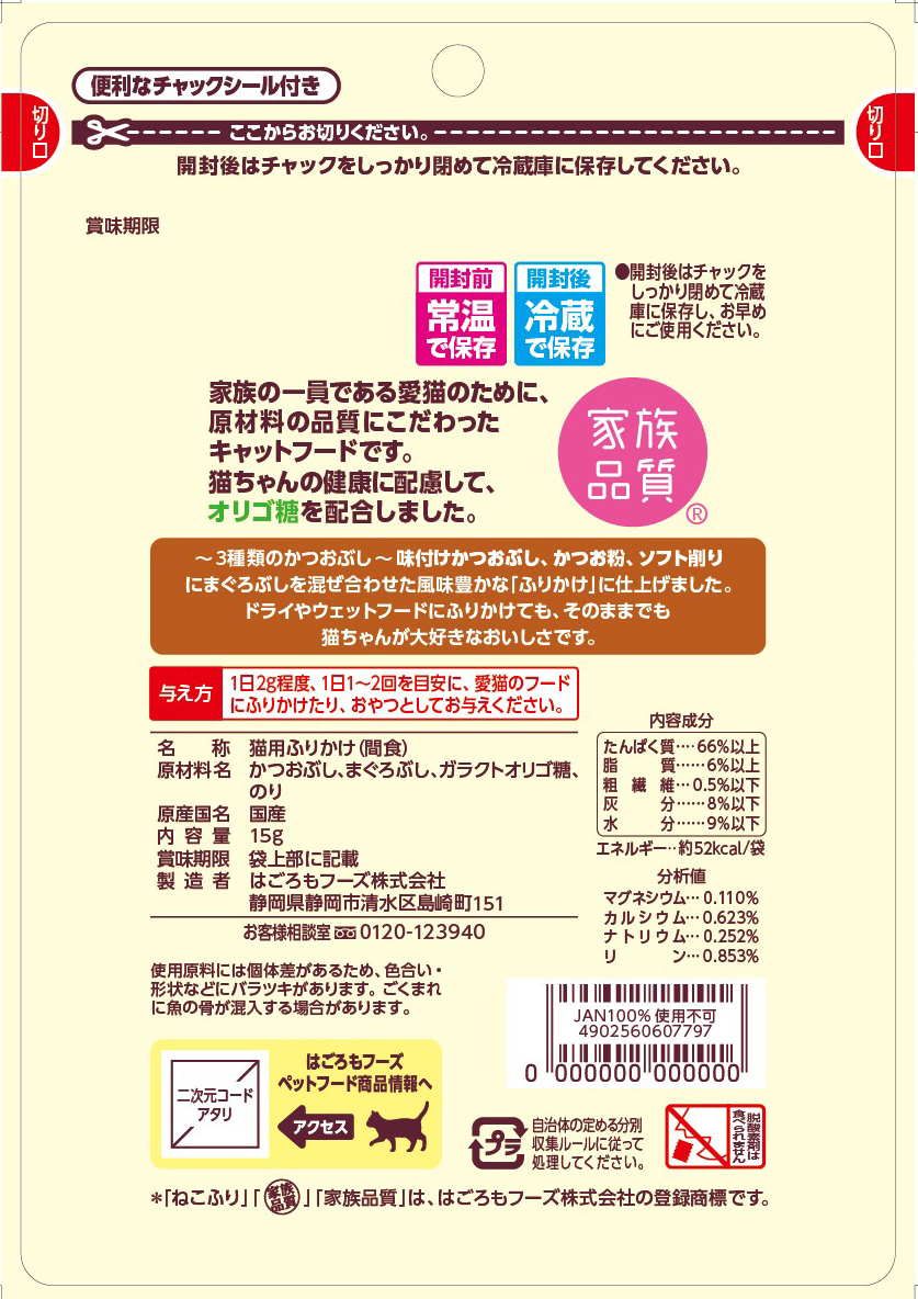 「3種類のかつおぶし」 味付けかつおぶし、かつお粉、ソフト削りにまぐろぶしを混ぜ合わせた風味豊かな「ふりかけ」に仕上げました。ドライやウェットフードにふりかけても、そのままでも猫ちゃんが大好きなおいしさです。猫ちゃんの健康を配慮して、オリゴ糖を配合しました。