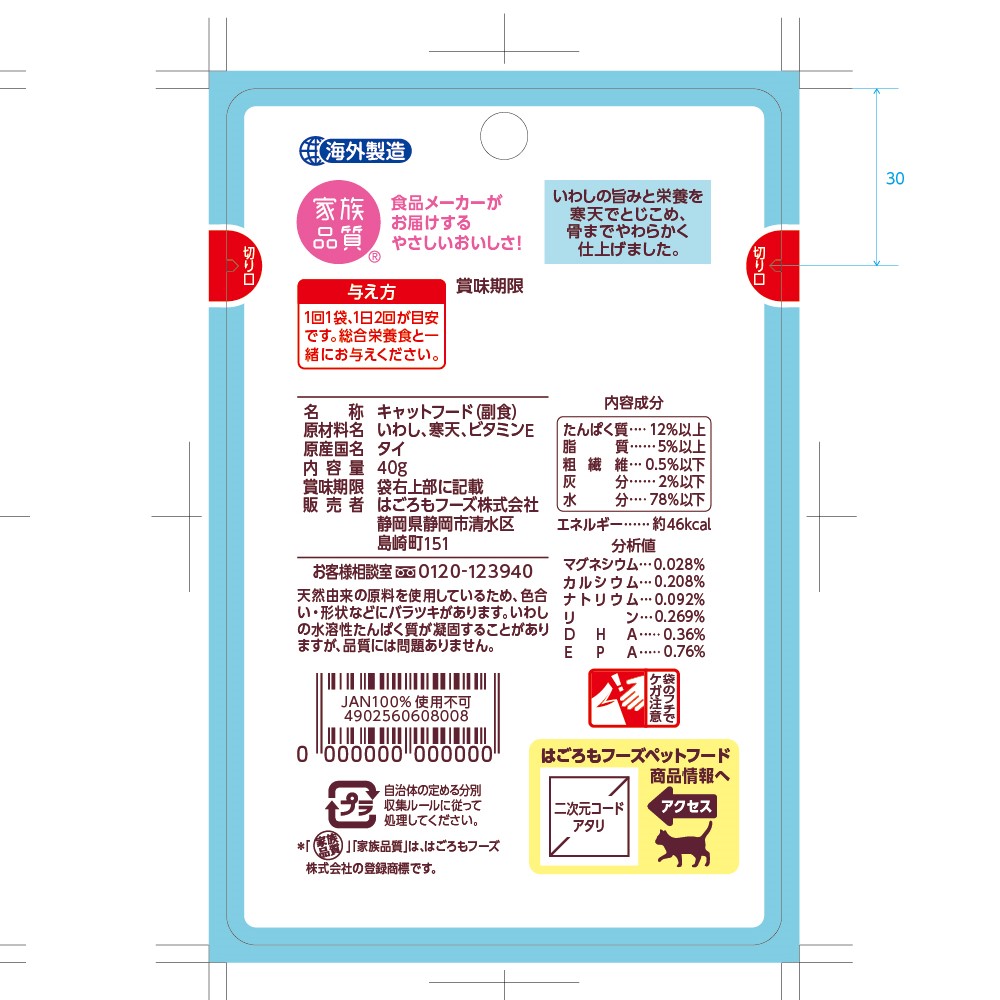 いわしの旨みと栄養を寒天でとじこめ、骨までやわらかく仕上げました。DHA、EPAが豊富に含まれています。猫ちゃんの好きな魚のにおいで食いつきもよいです。増粘剤、調味料、着色料、発色剤 不使用。