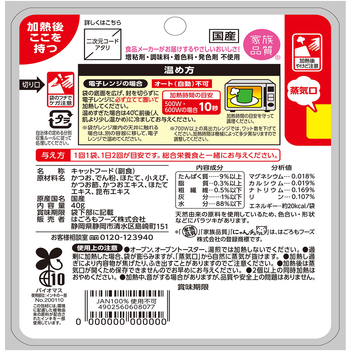 レンジ対応パウチのため、簡単に温められます。温めることで香り立ち、猫ちゃんの食いつきアップ!・増粘剤・調味料・着色料・発色剤 不使用!・風味豊かなかつおの海鮮風味です
