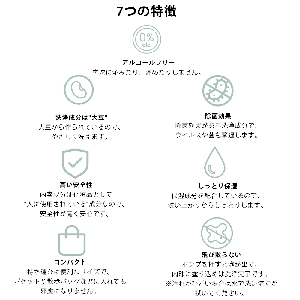 肉球を泡で優しく洗浄・保湿・除菌ができるのでいつでも清潔になおかつきれいに保てます。